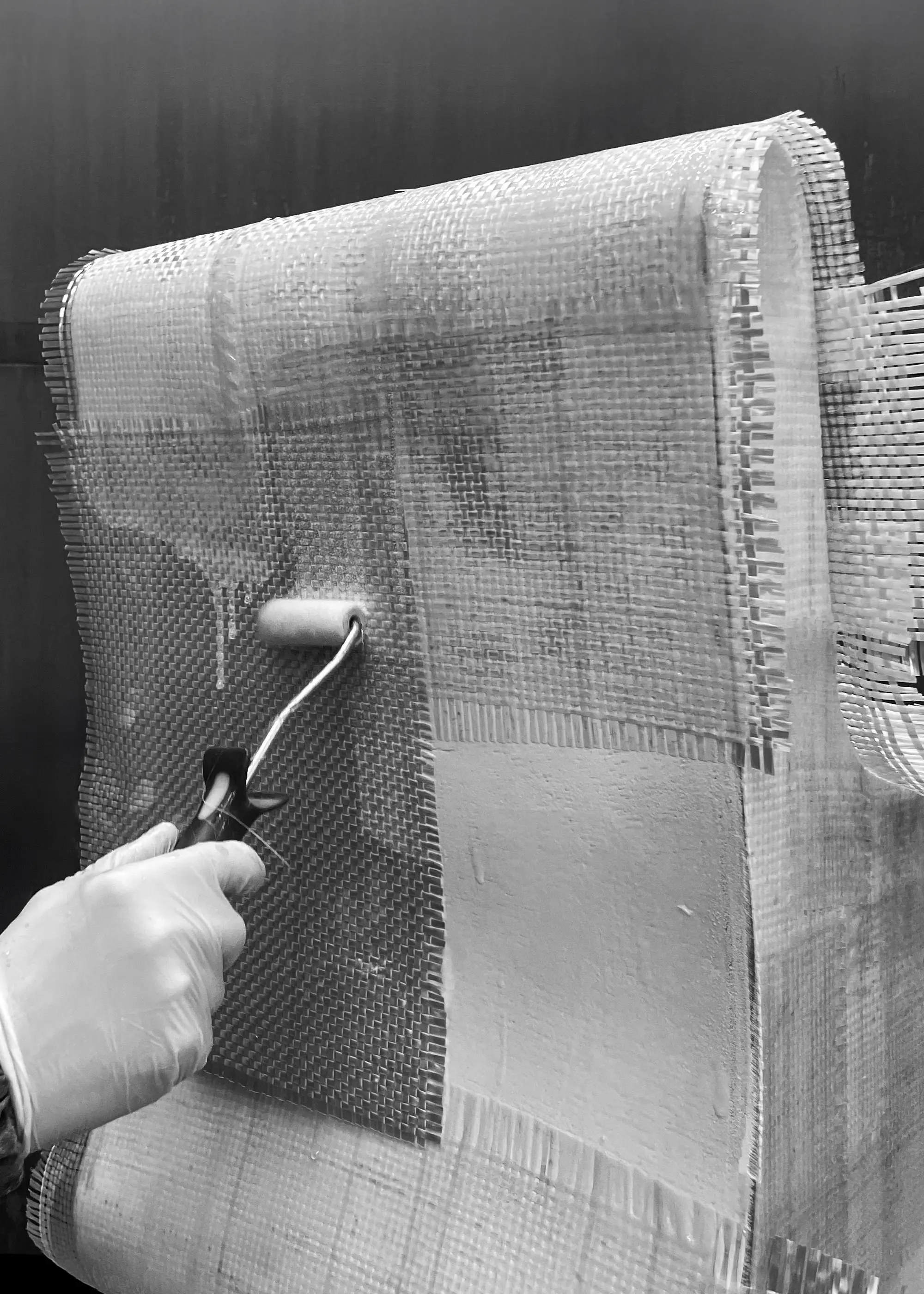 HESSENTIA regards itself as a pioneer in the use of fiberglass in interior design, a material with great expressive power, but generally used in sectors such as nautical and automotive. Unlike these sectors, fiberglass is worked artistically: glass fibers, felted or woven, are overlapped and soaked with a fluid resin, which once hardened allows the desired shape to be obtained.