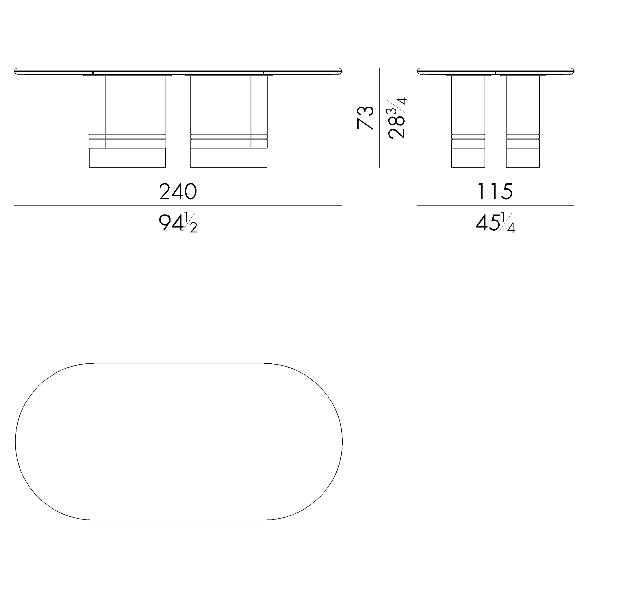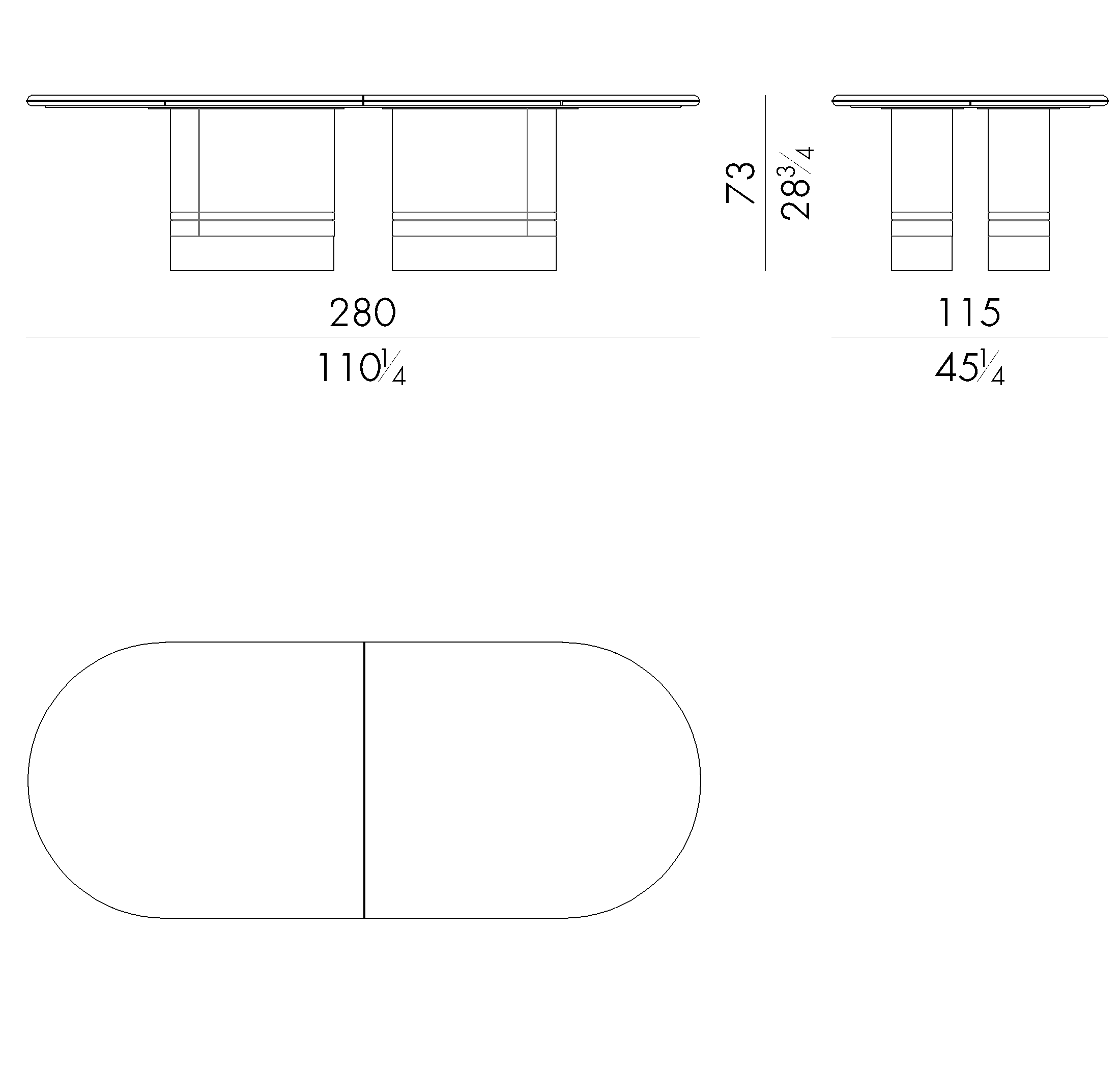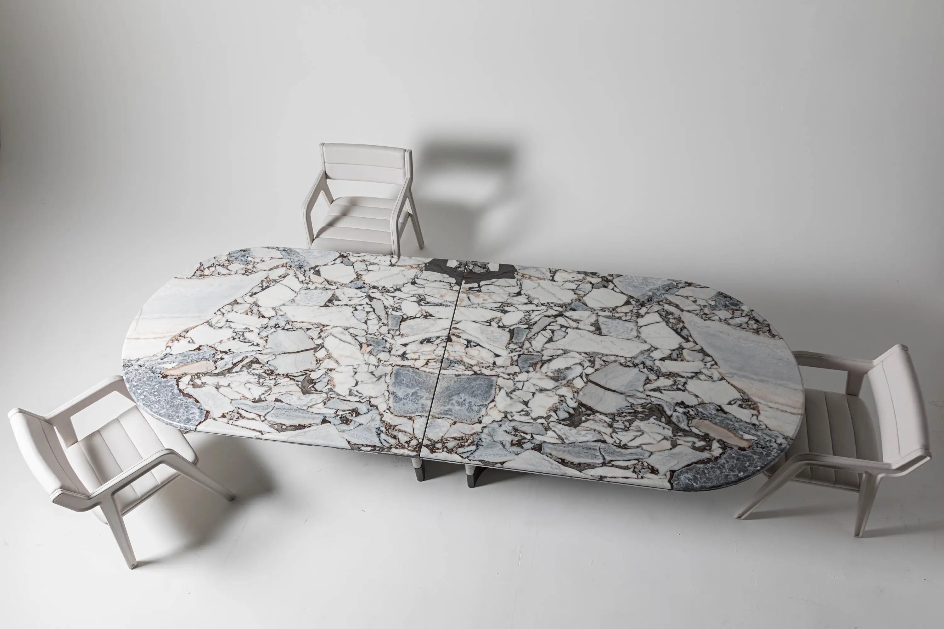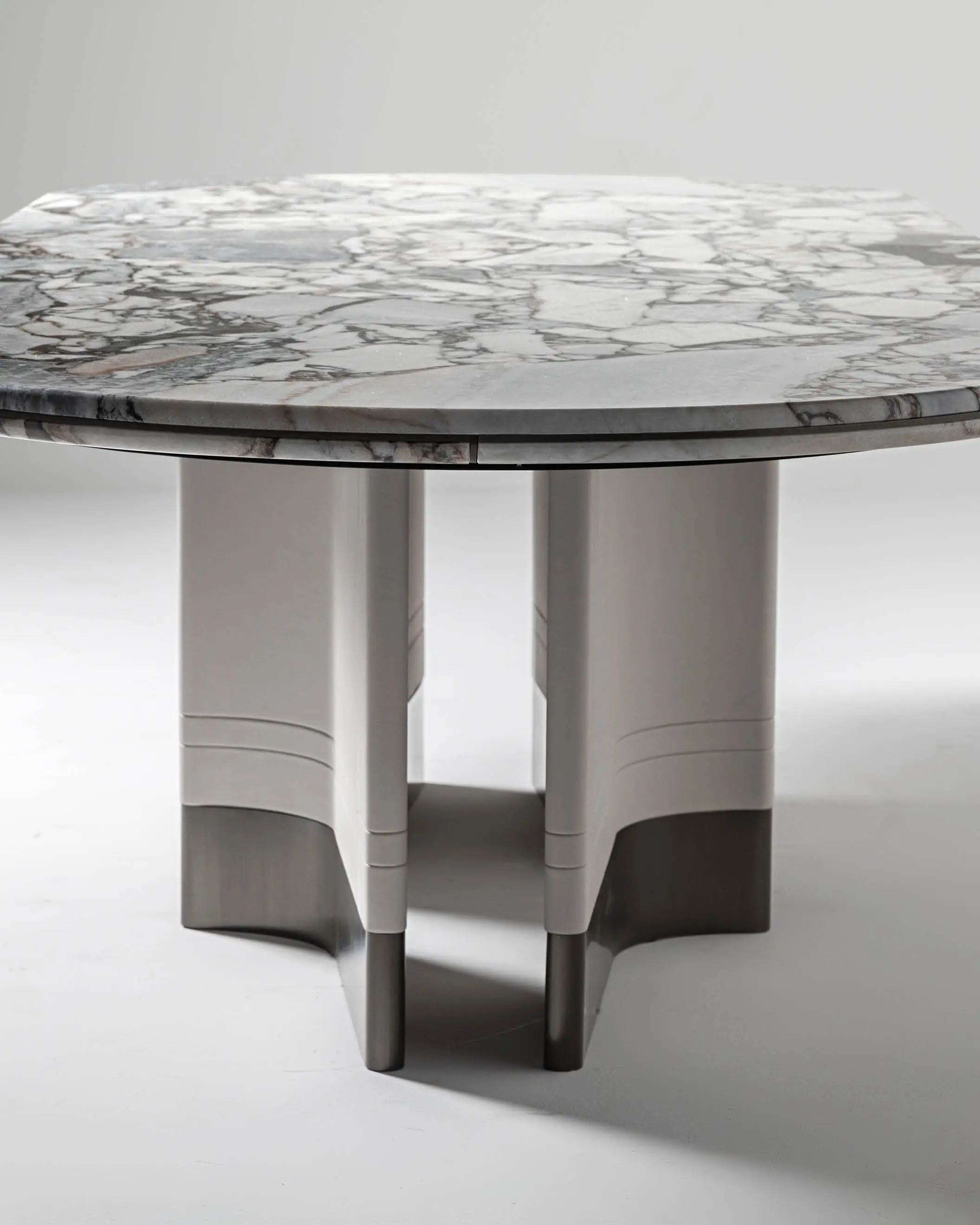 Sophisticated and refined, the table Adone is an elegant protagonist of the dining area. The precious materials used for its realization are further enhanced thanks to the harmonious sinuous shapes. The top, rounded at the ends, is an important block of marble with a metal profile. In larger sizes, the two-piece division of the top becomes even more interesting thanks to the game of symmetries commonly called ”open book”. Great attention is paid to the base: the metal supports the four elements finely covered in leather and engraved both vertically and horizontally.