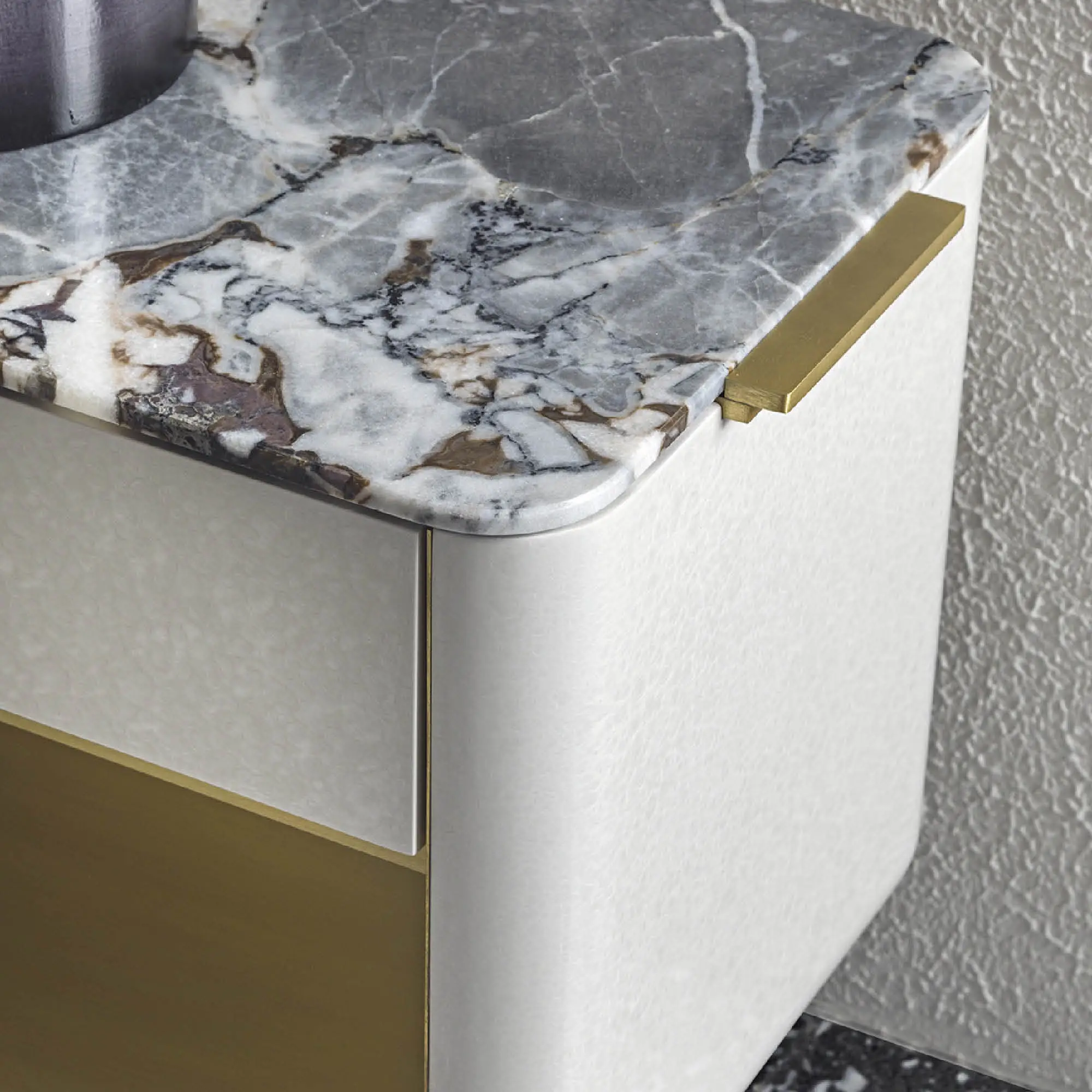 Bridge storage unit with drawers has a contemporary look thanks to its horizontal lines with rounded corners: the mother of pearl lacquered version enhances its brilliance becoming a suitable element for contemporary rooms. The metal parts that cover the internal side of this storage unit represent the main characteristic of the structure and, together with the “open-book” marble top of the biggest size option, it conveys a sophisticated elegance feeling.