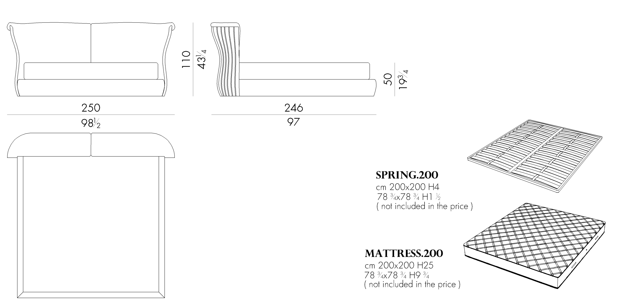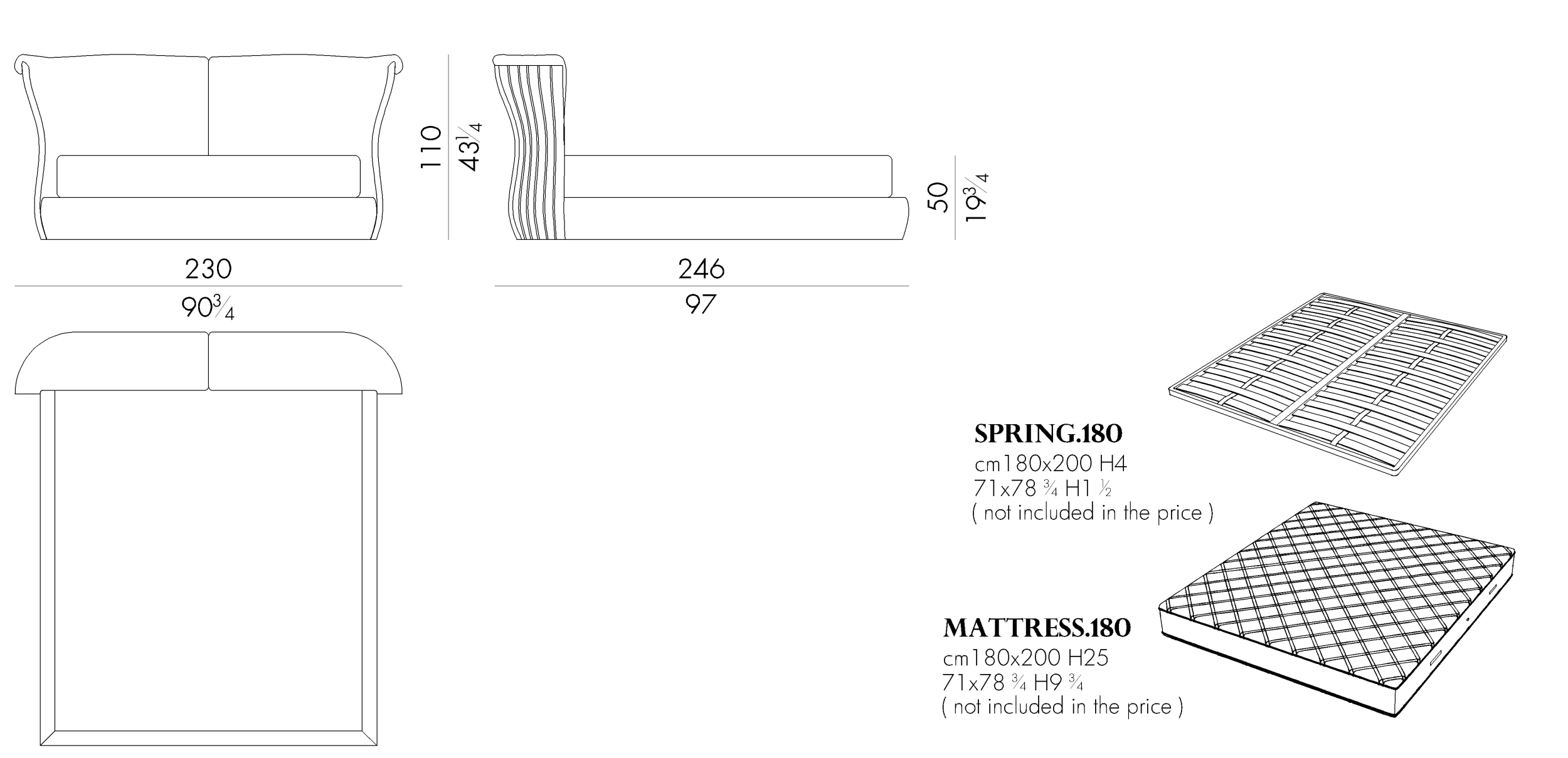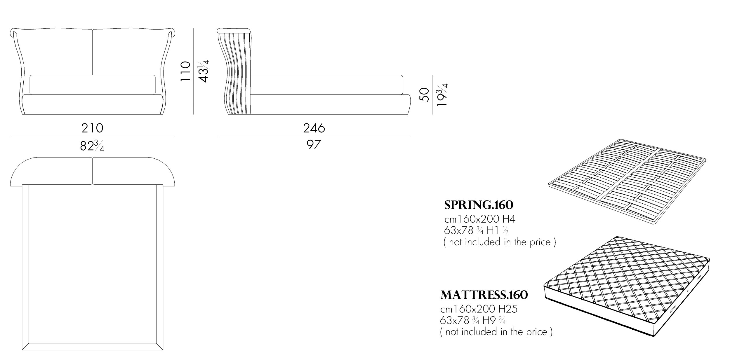 Cannes bed has at the end of the headboard a series of curved plywood elements with an oval section covered in leather or fabric by skilled craftmen. Two soft cushions with exclusive tailored seams rest on the curved elements of the back. It can be easily inserted in contemporary villas but also in apartments located in ancient buildings.