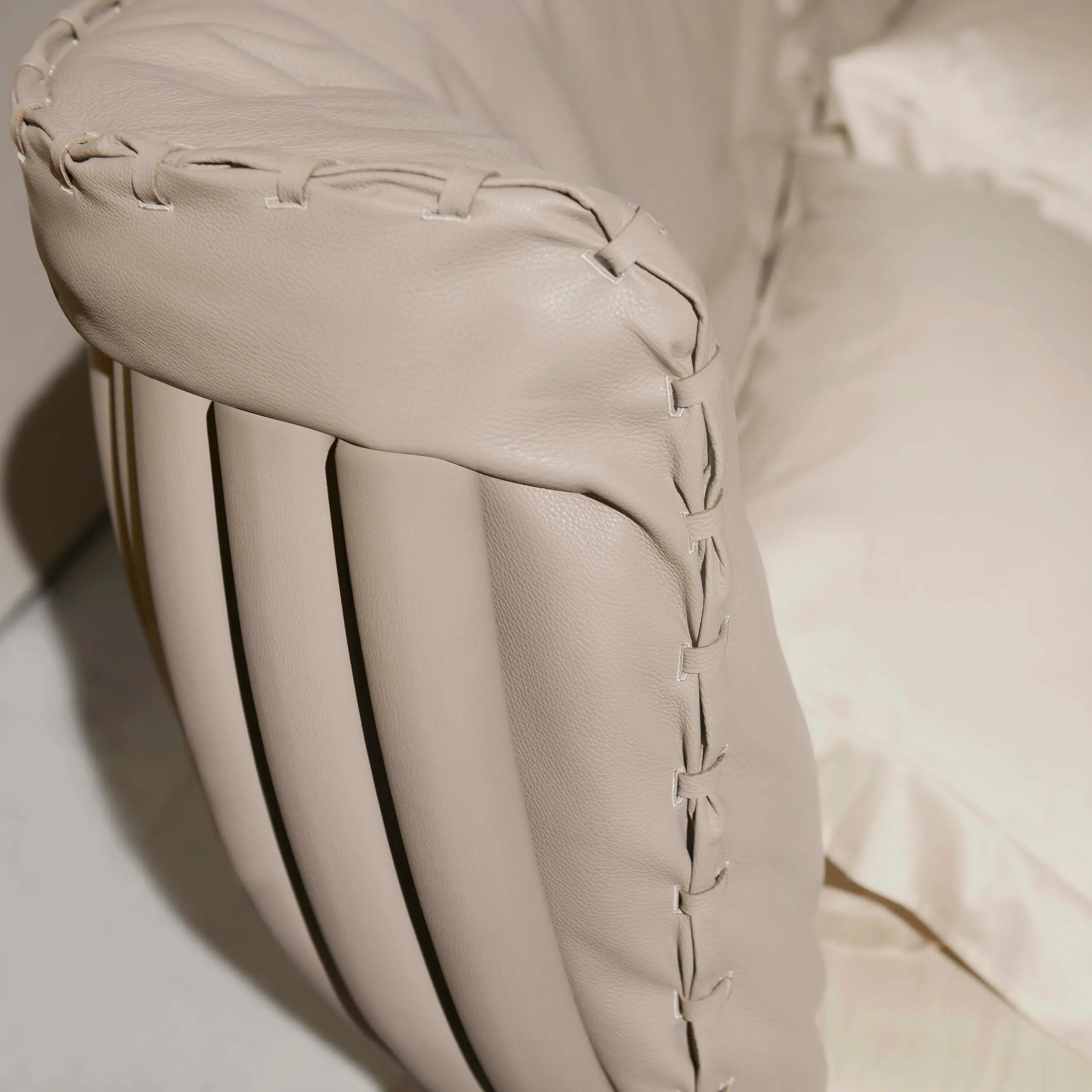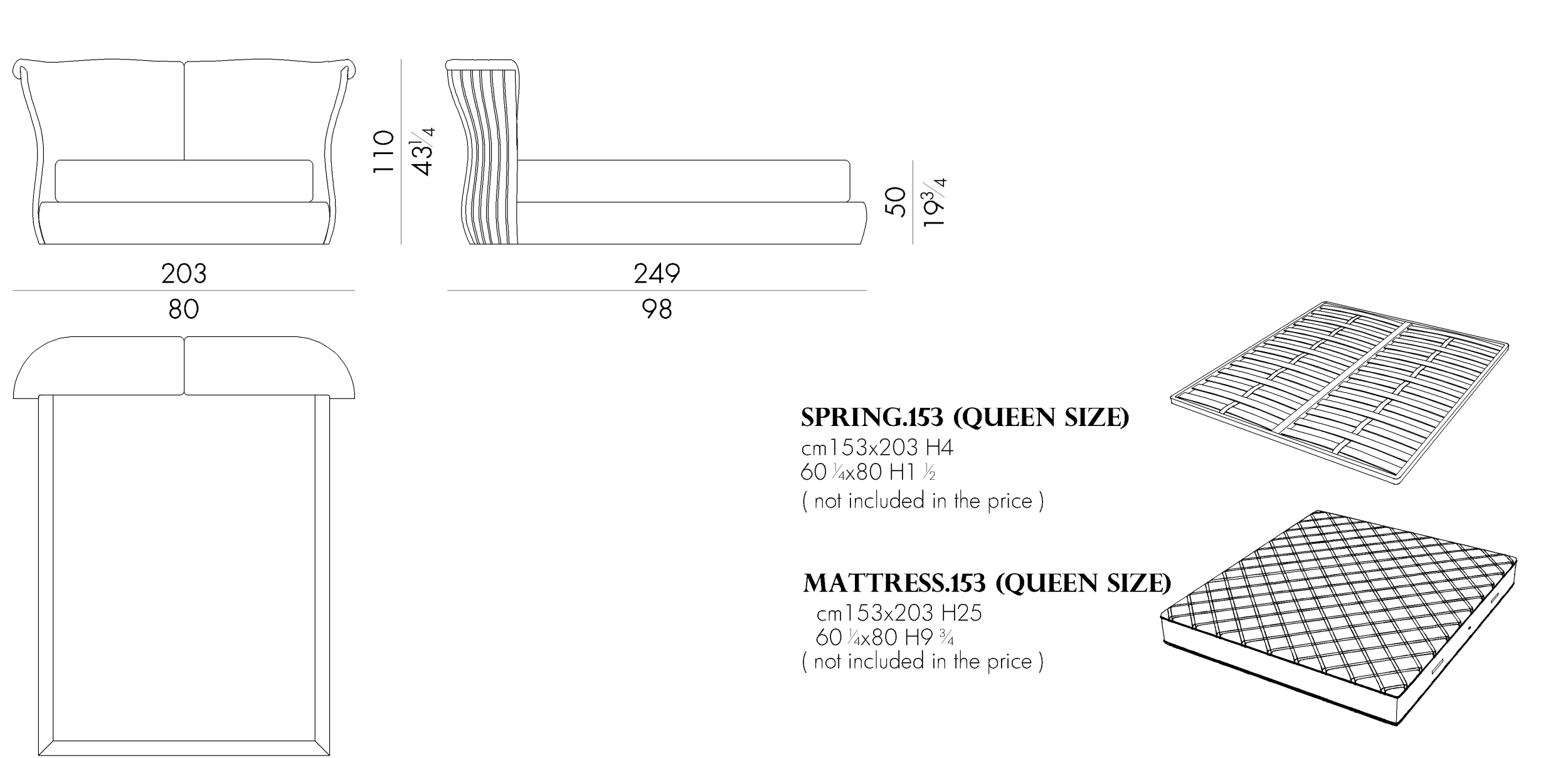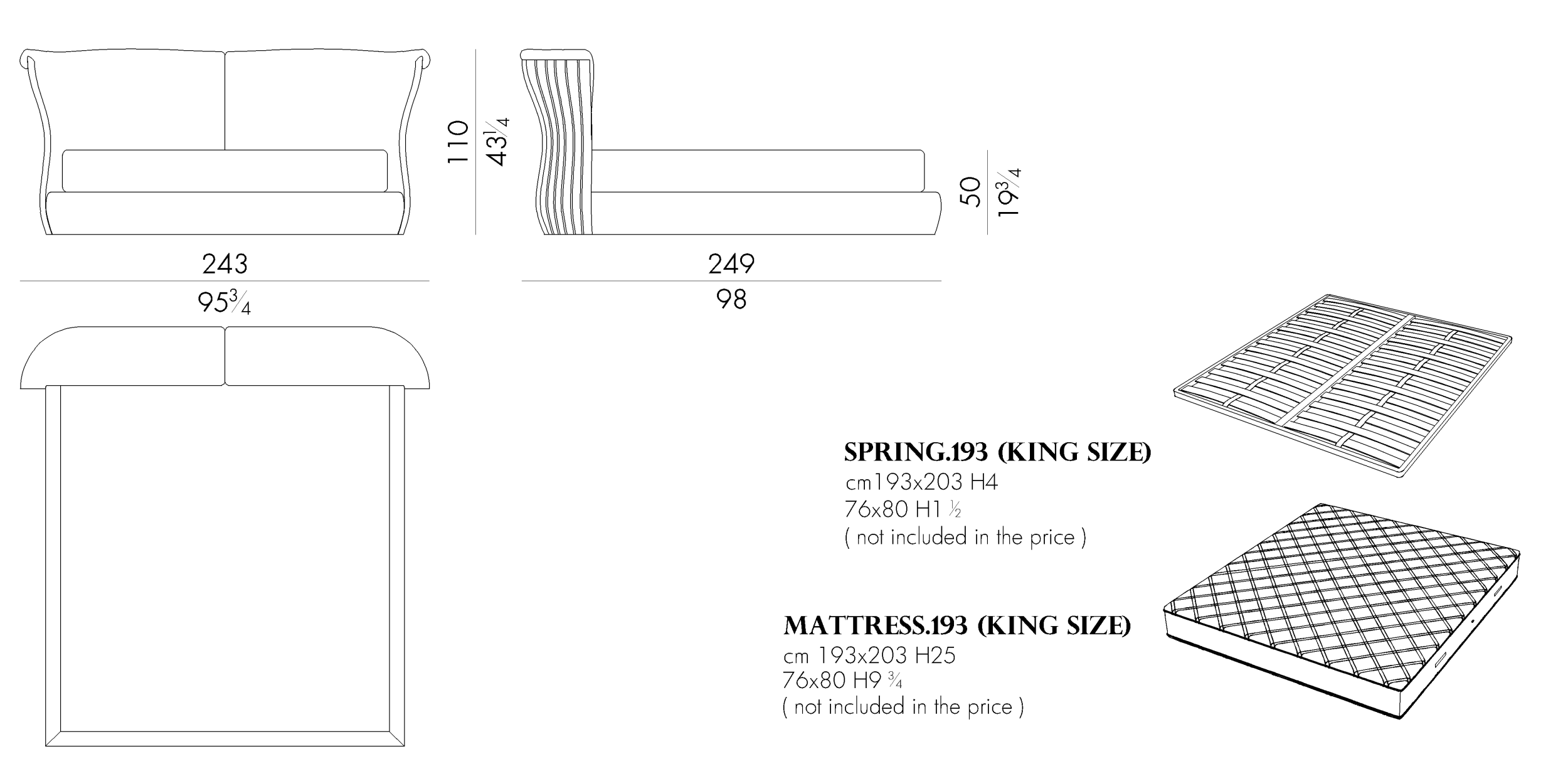 Cannes bed has at the end of the headboard a series of curved plywood elements with an oval section covered in leather or fabric by skilled craftmen. Two soft cushions with exclusive tailored seams rest on the curved elements of the back. It can be easily inserted in contemporary villas but also in apartments located in ancient buildings.