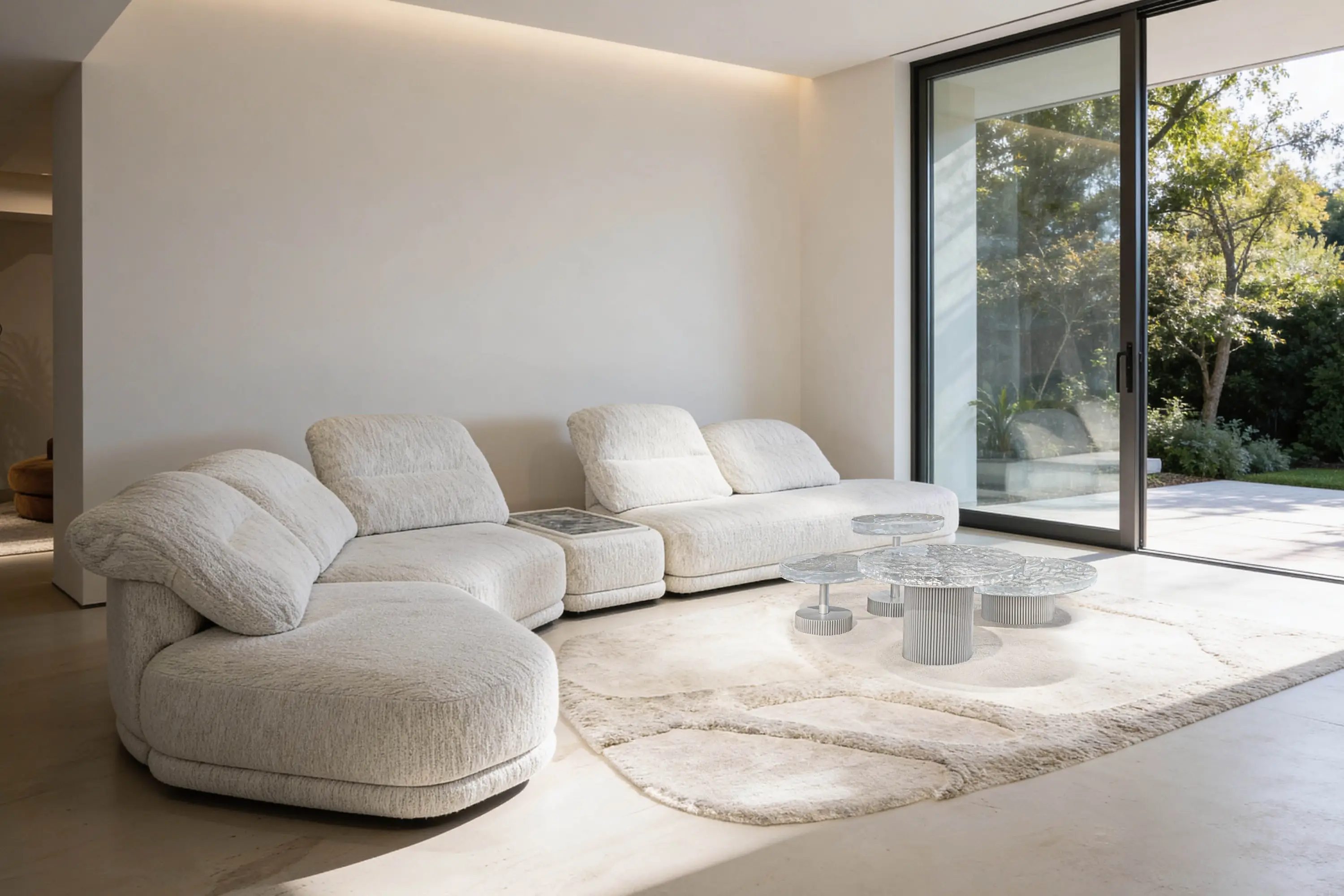 The Cliff modular sofa is designed to adapt to all comfort needs. The core of this sofa is the backrest made up of a cushion whose inclination is easily adjustable, allowing you to find the most comfortable position in a simple and intuitive way. The modules can be combined to create unique shapes, ranging from angular to semi-circular up to more unusual forms. Thanks to its flexibility the Cliff sofa can be adapted to its surroundings, creating sinuous configurations even in more geometric ambiances. Available in leather and fabric, covers are fully removable. The modular system includes trapezoidal and rectangular poufs, available with marble tops or fully upholstered, to complete and enrich the relaxation experience.