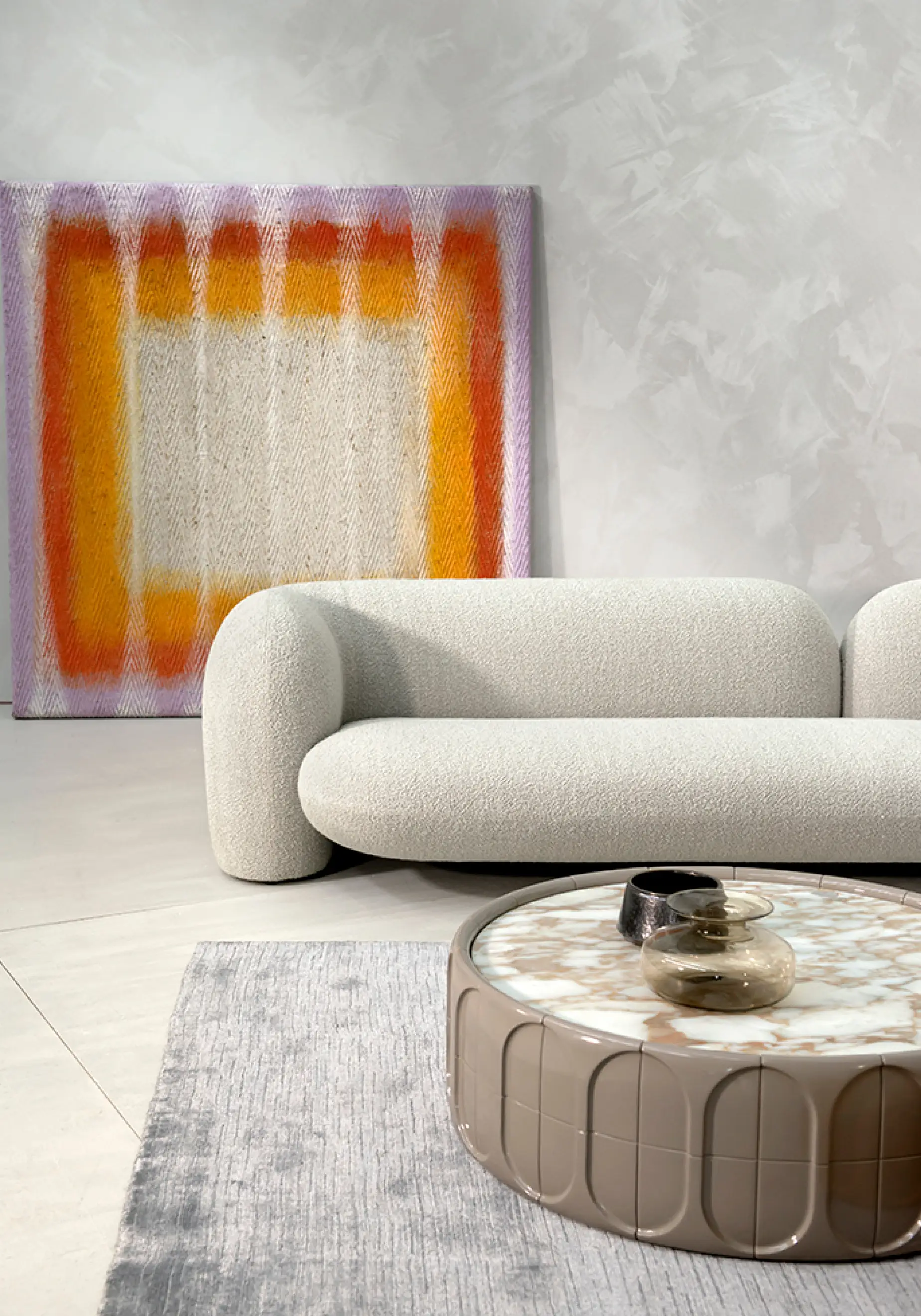 Concave coffee table enriches the living area with a sculptural touch and is characterized by a round shape embellished on the surface by many three-dimensional facets. It is available in various colours with a glossy or matt finish.
