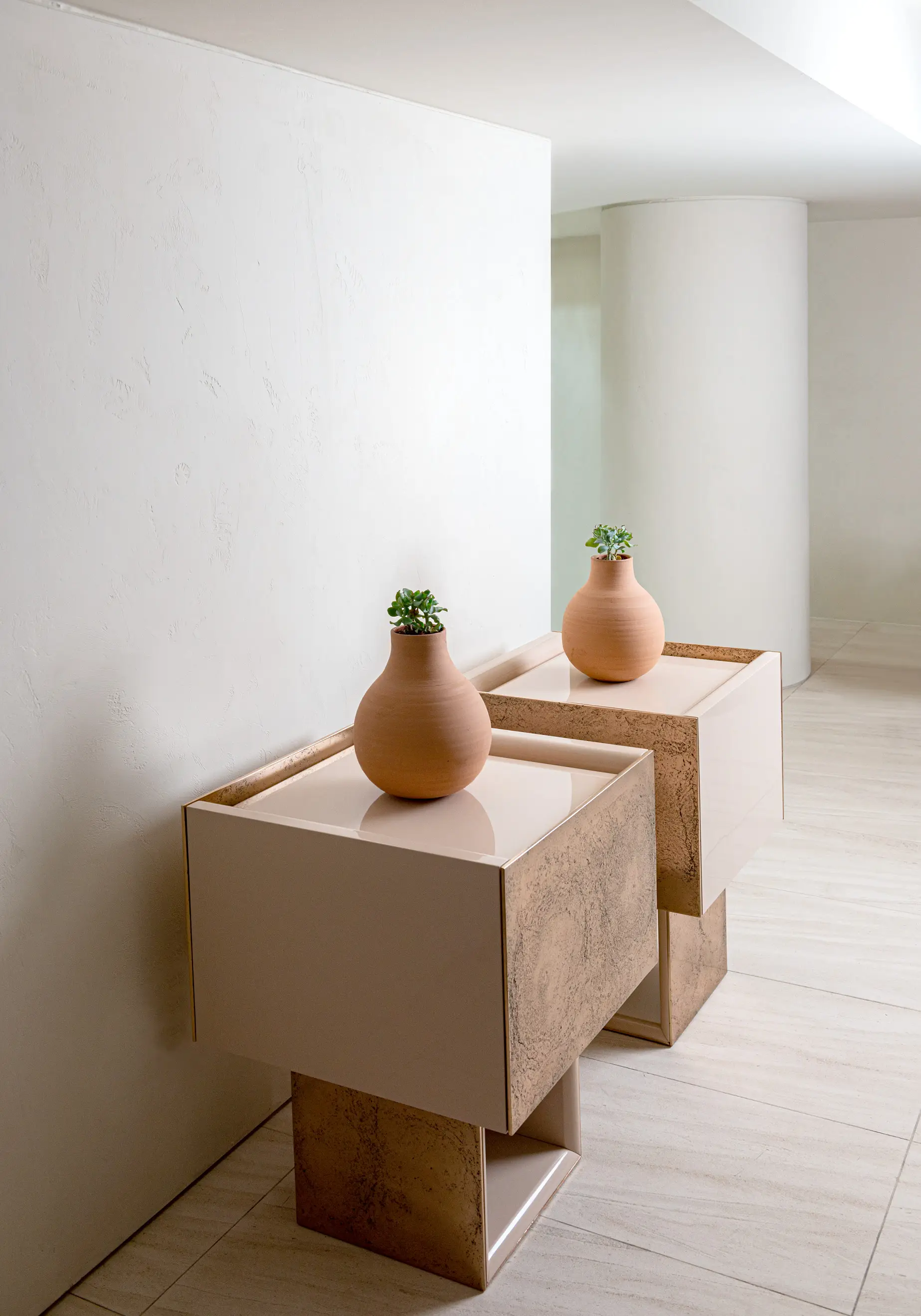Cubotto is a storage unit with just one flap door which expresses its best when in pairs. The charm of the bronze metal obtained through the ancient technique of casting is combined with a bright colour, available in a variety of shades.