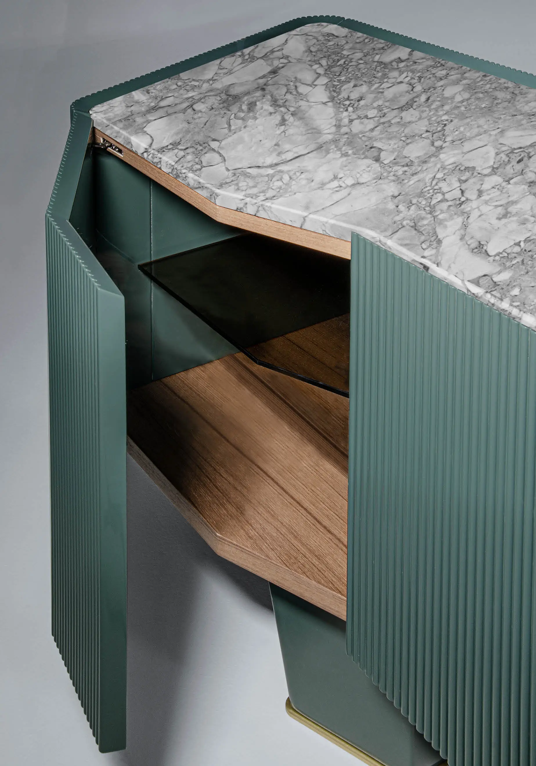 Diamond è un esempio di mobile contenitore dalle linee contemporanee particolarmente adatto ad un’area living ecclettica. La forma delle basi con doppio motivo a “ L “ sostiene un contenitore con ante lavorate con un effetto “millerighe”. Tutte le finiture disponibili sono state selezionate tra un’ampia gamma di colori naturali facilmente abbinabili con altri pezzi. È disponibile nella versione a tre o quattro ante apribili verso l’esterno. La coerenza progettuale che lo contraddistingue gli regala un aspetto moderno ed esclusivo dove arte e design sono in perfetta armonia.