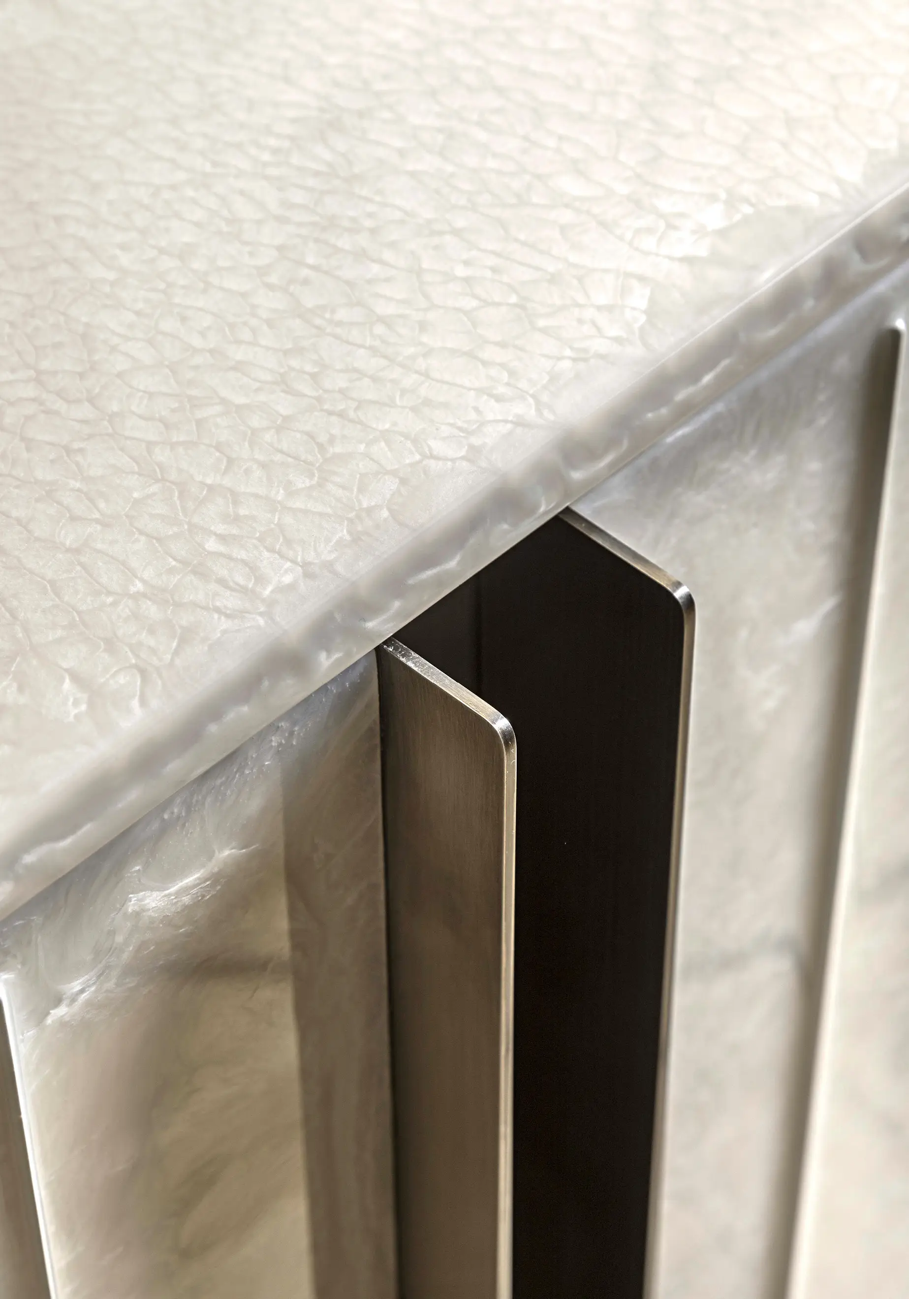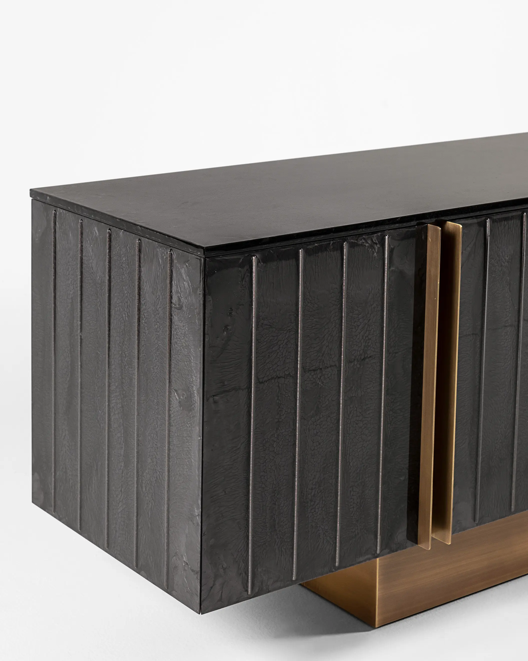 Domino storage unit suggests a perfect balance between design and materials used like decorative resin, colored pigments and natural finishes. The main features of this item are represented by vertical lines and three-dimensionality of the doors where metal inserts are not only decorative but also functional to open them. The bottom parts of the drawers are upholstered with saddle leather, a precious material that matches really well with oak wood used for internal structure. The refinement of this storage unit may be exalted if combined with marble tables.