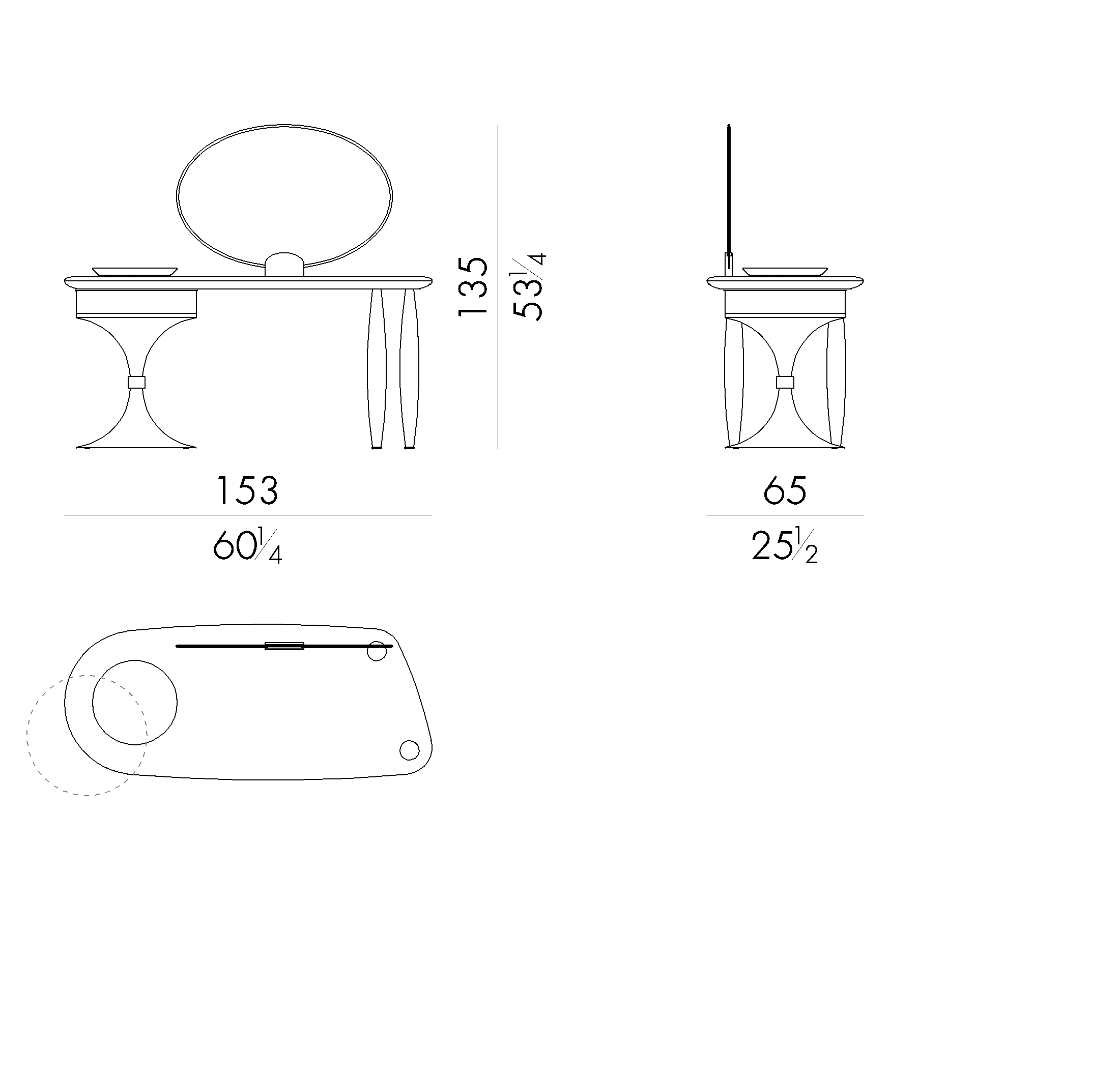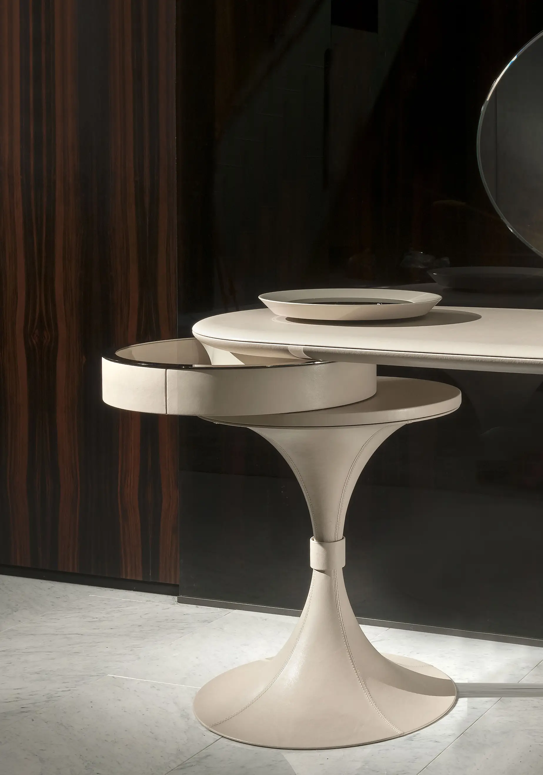Completely covered in leather, the base recalls the same-named tables collection. Two legs tapered downwards and upwards sustain the top. The vanity has a cylindrical drawer that opens through a rotational movement. The top is equipped with a multi-purpose tray with a lacquered finish and an oval-shaped mirror harmonically fixed to the vanity top.