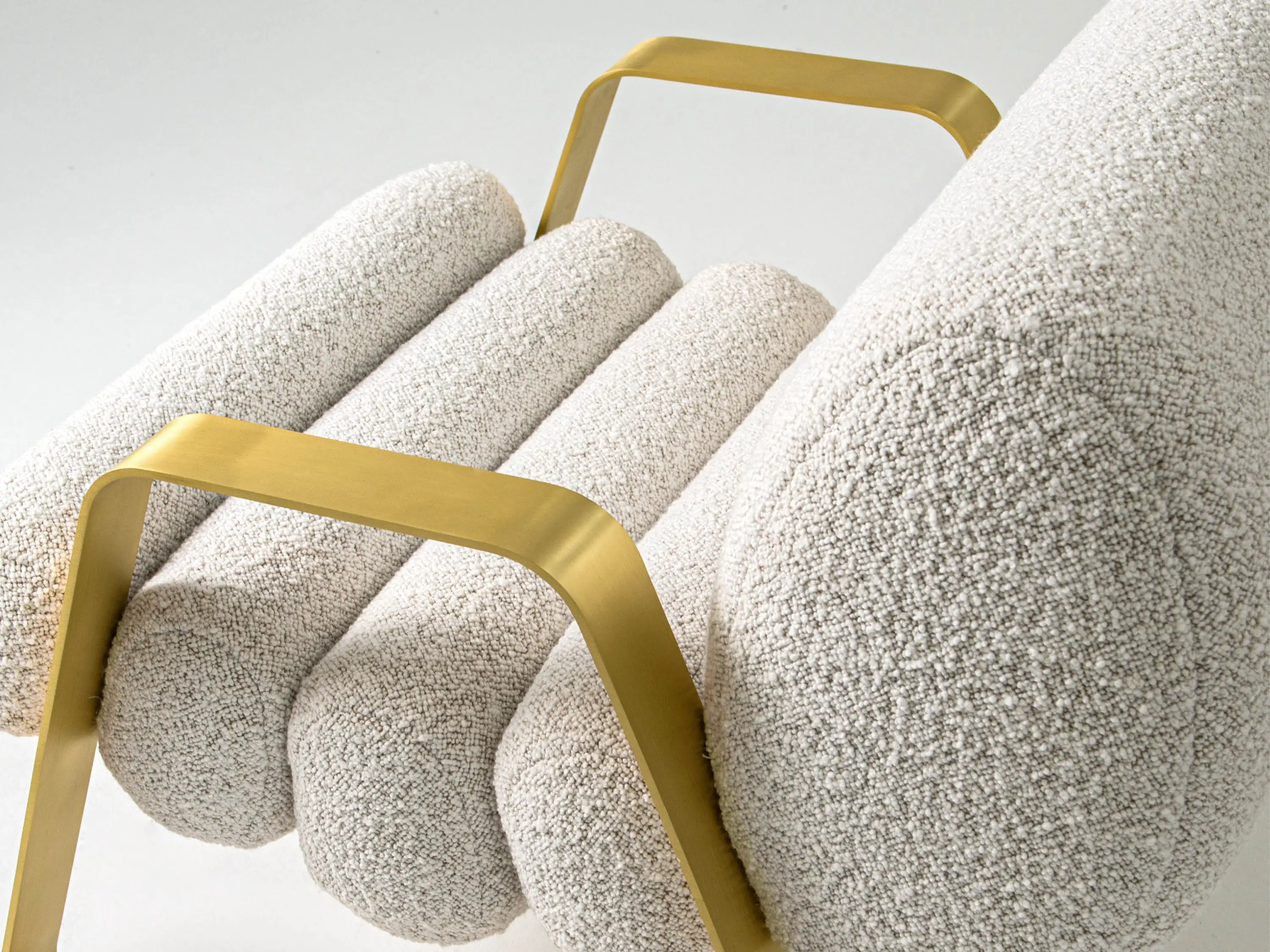 The Dool armchair is distinguished by its informal design. The upholstered parts, enveloping and carefully trimmed, are supported by two generously sized trapezoidal metal elements that also serve as armrests. A wide range of leather and fabric options makes it a versatile armchair, that fits stylishly into any setting, from residential to contract and wellness spaces.
