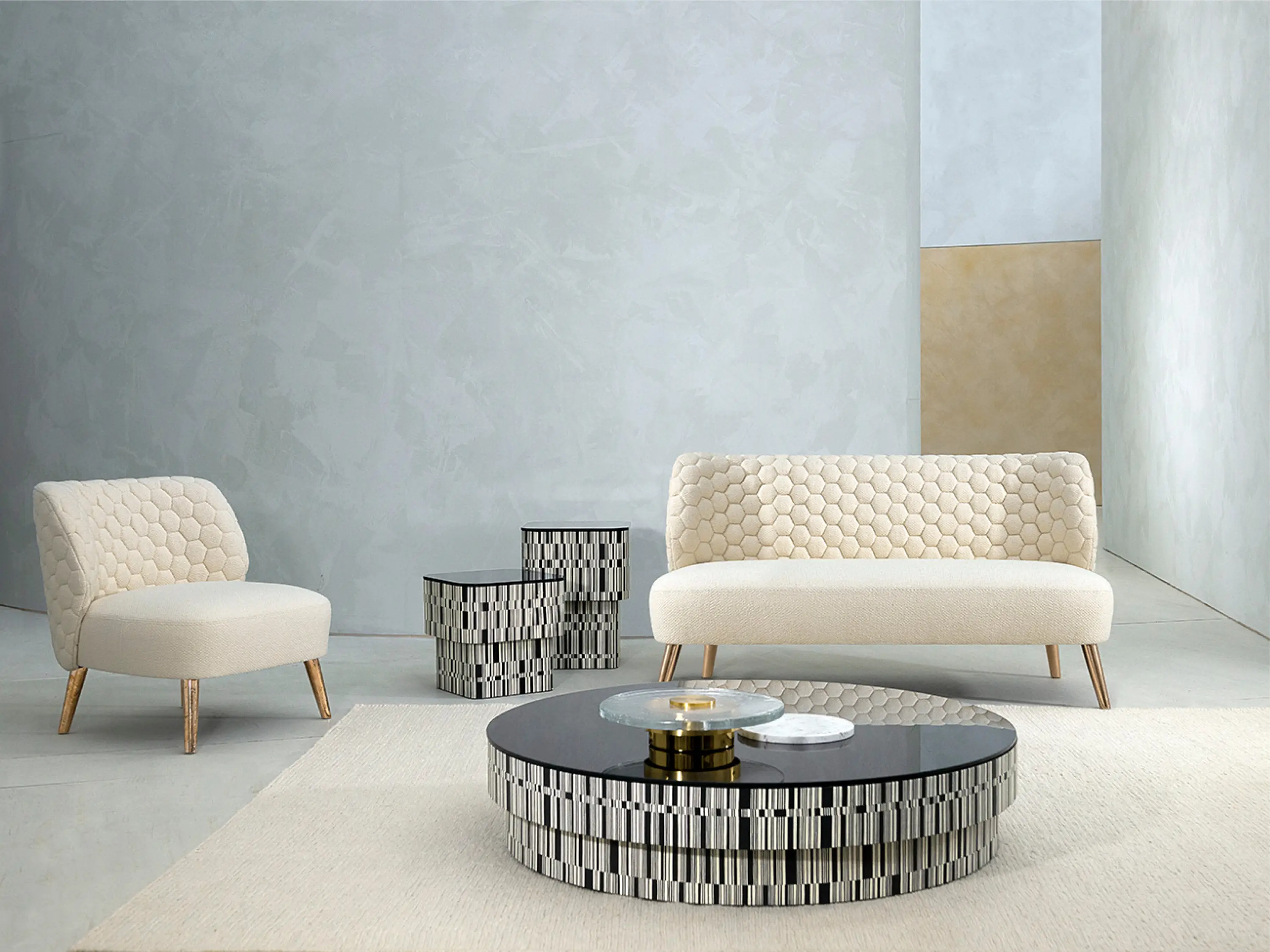 Different shapes and proportions characterize the coffee table collection Enigma. White and black wood veneer alternates in an irregular way. The Matrix finish of coffee table Enigma is available in matt or shiny version. The black glass top completes the entire structure.