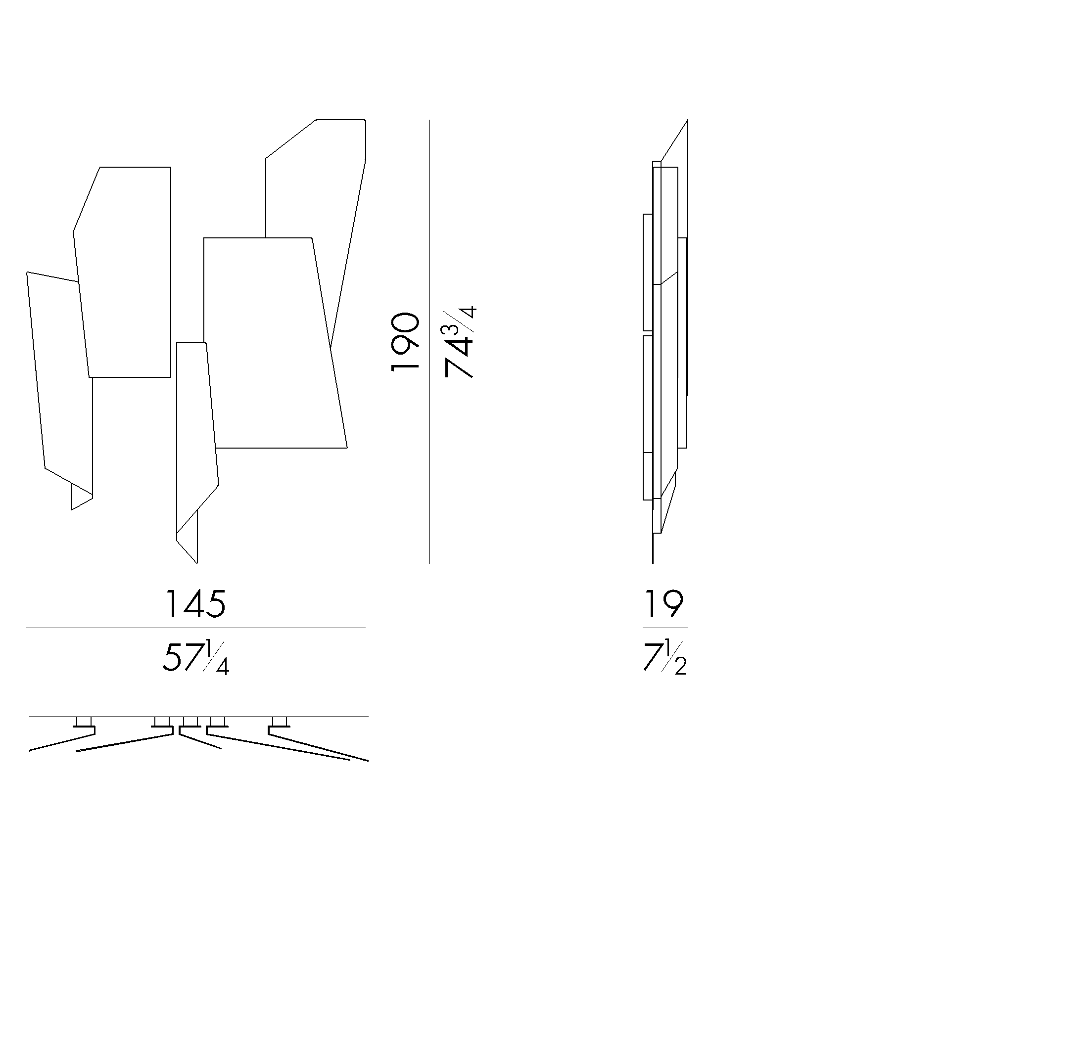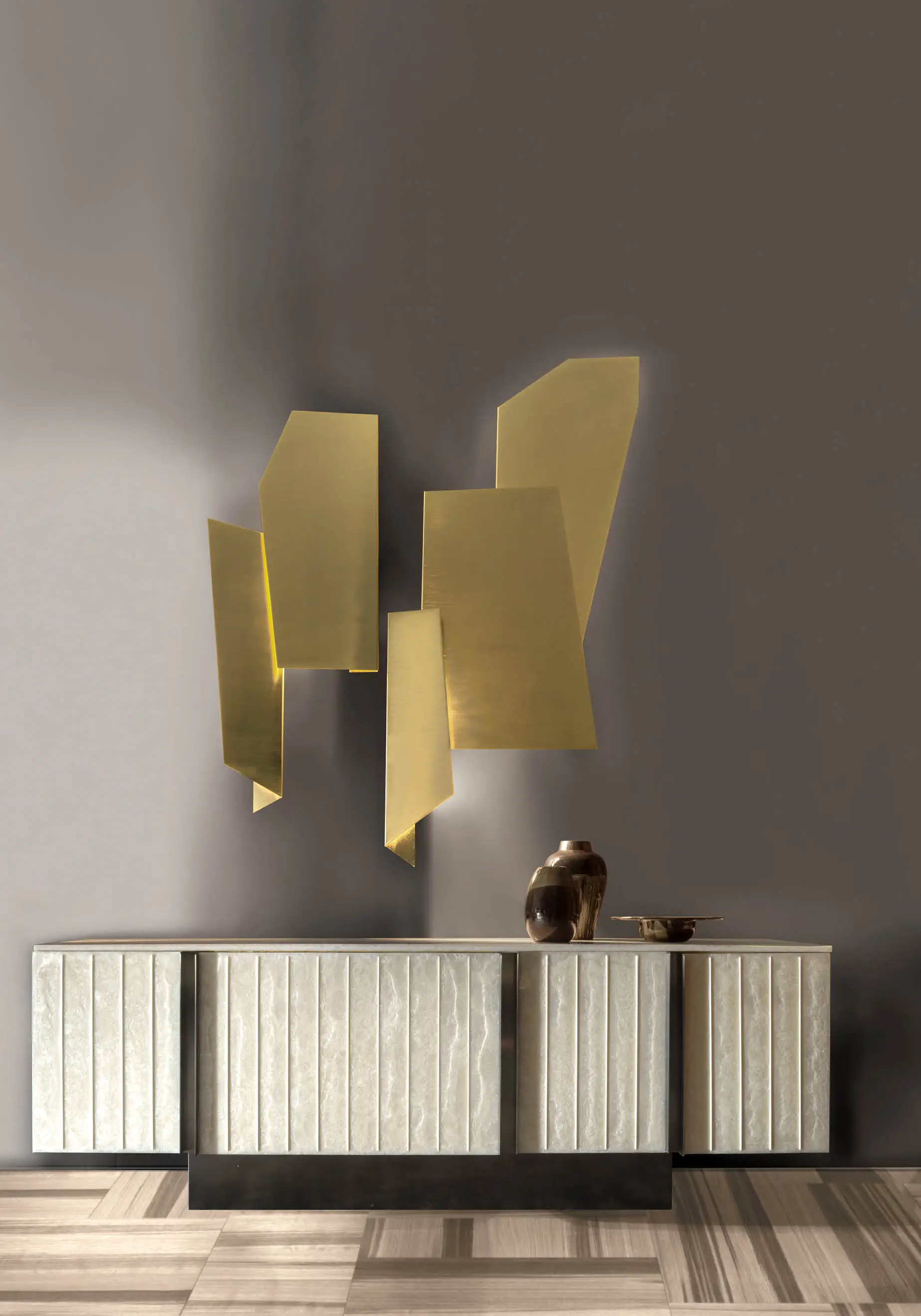 As well as being a wall-mounted lighting system, the wall lamp Geometry is a real decorative element suitable for living areas, hotel lobbies or representative offices. The combination of 5 geometric elements in brushed metal creates a new geometry that each user can customize by spacing these elements in different ways. Lights is diffused indirectly and thanks to the different shape of all the elements, it projects on the wall a play of reflections and shadows.