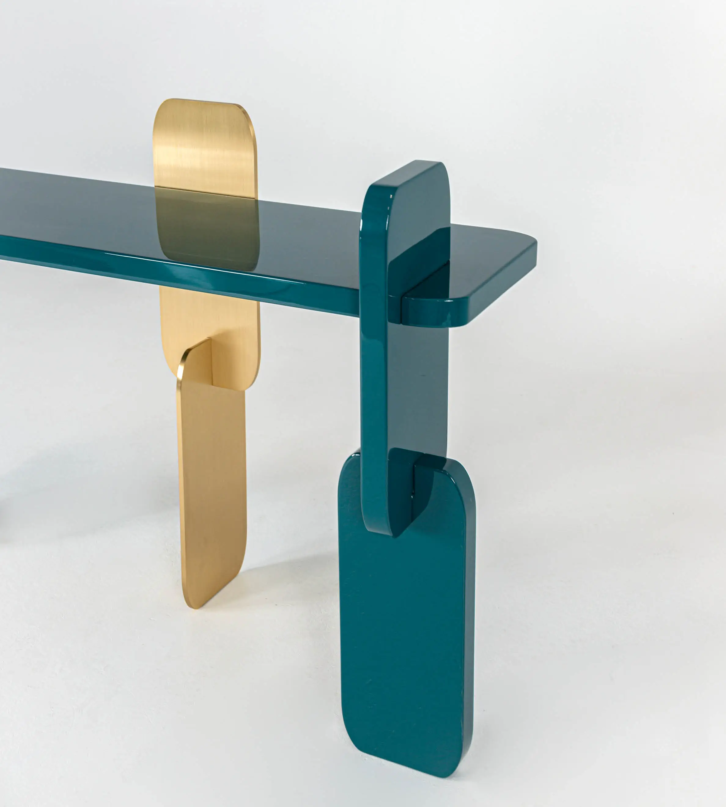 Greffage is a console with straight lines that define the space, playing on different parallel and perpendicular levels.
