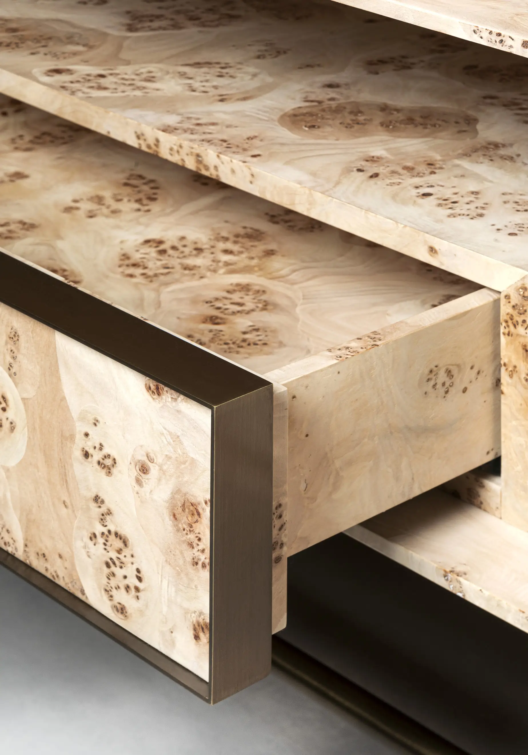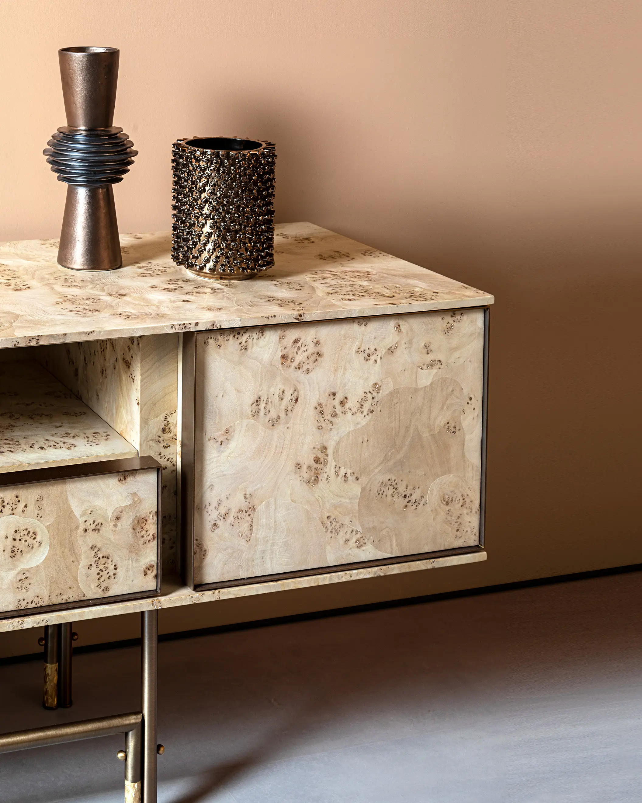 Harbour storage unit is characterized by the use of poplar root, a particular wood essence thanks to its straw yellow colour with light and dark brown rings with irregular shapes and a great aesthetic effect. The particularity of the wood contrasts with the minimal lines of the structure, supported by a tubular metal base.