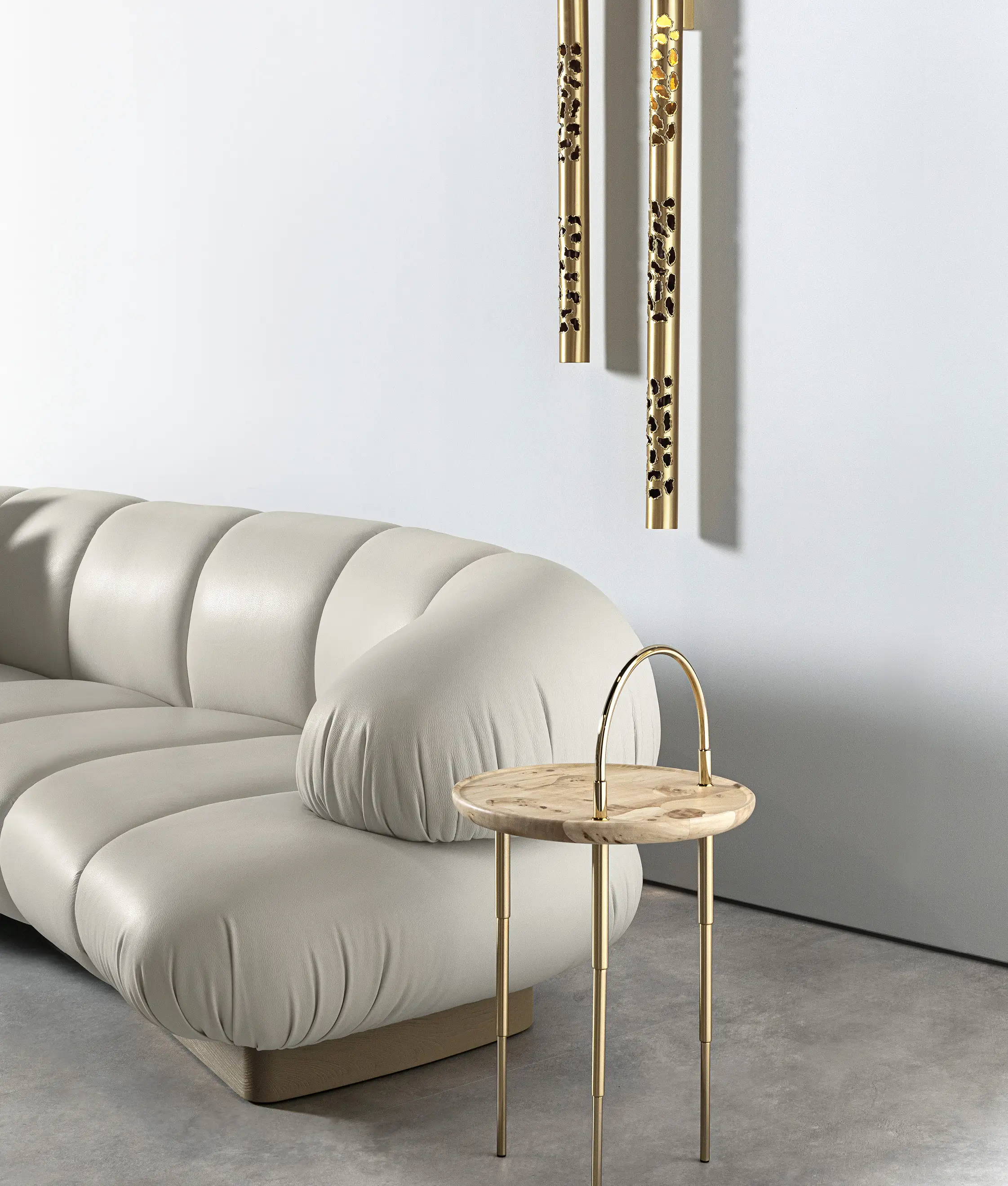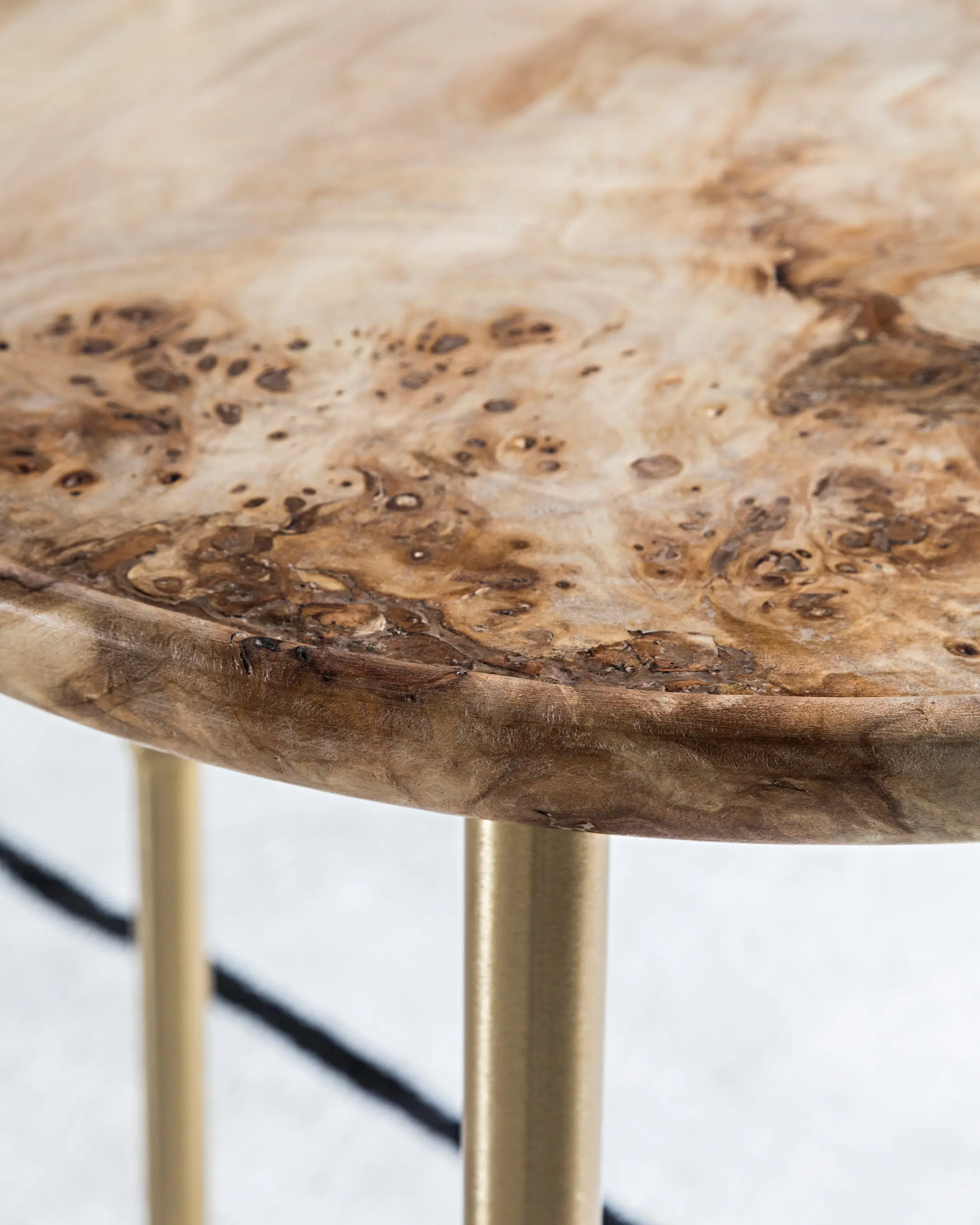 Side table Heron is a very refined element composed by a tray-shaped top made up of poplar root that conveys warmth to the entire structure. The top is supported by three slight legs in shiny and brushed finish and two of them, moving through the top, turn into a handle that helps to move the side table around the living area.