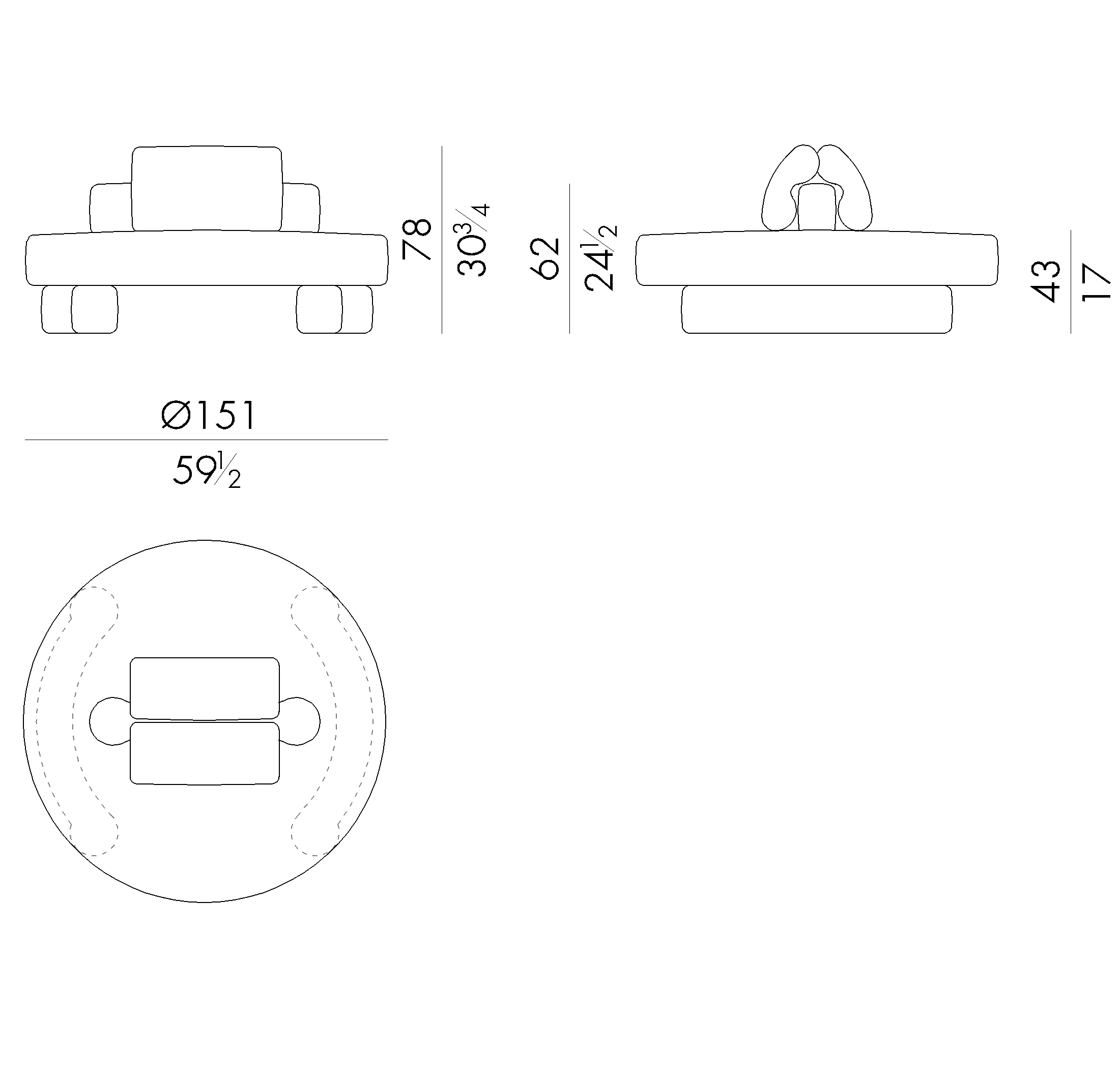 Isla circular sofa, consisting of a large circular seat and two back to back cushions, is a cosy island of informal relaxation.