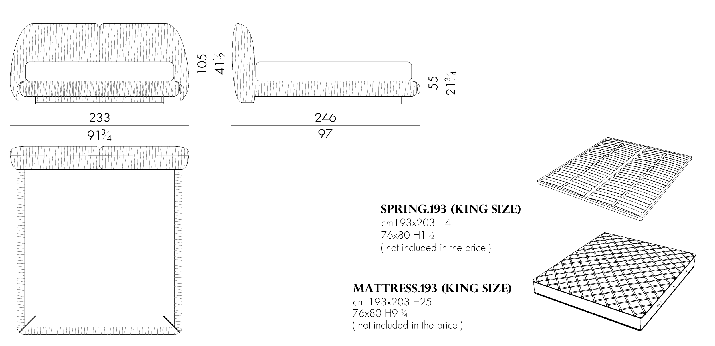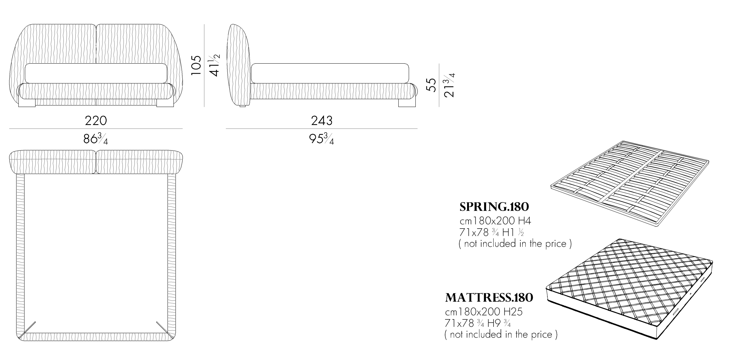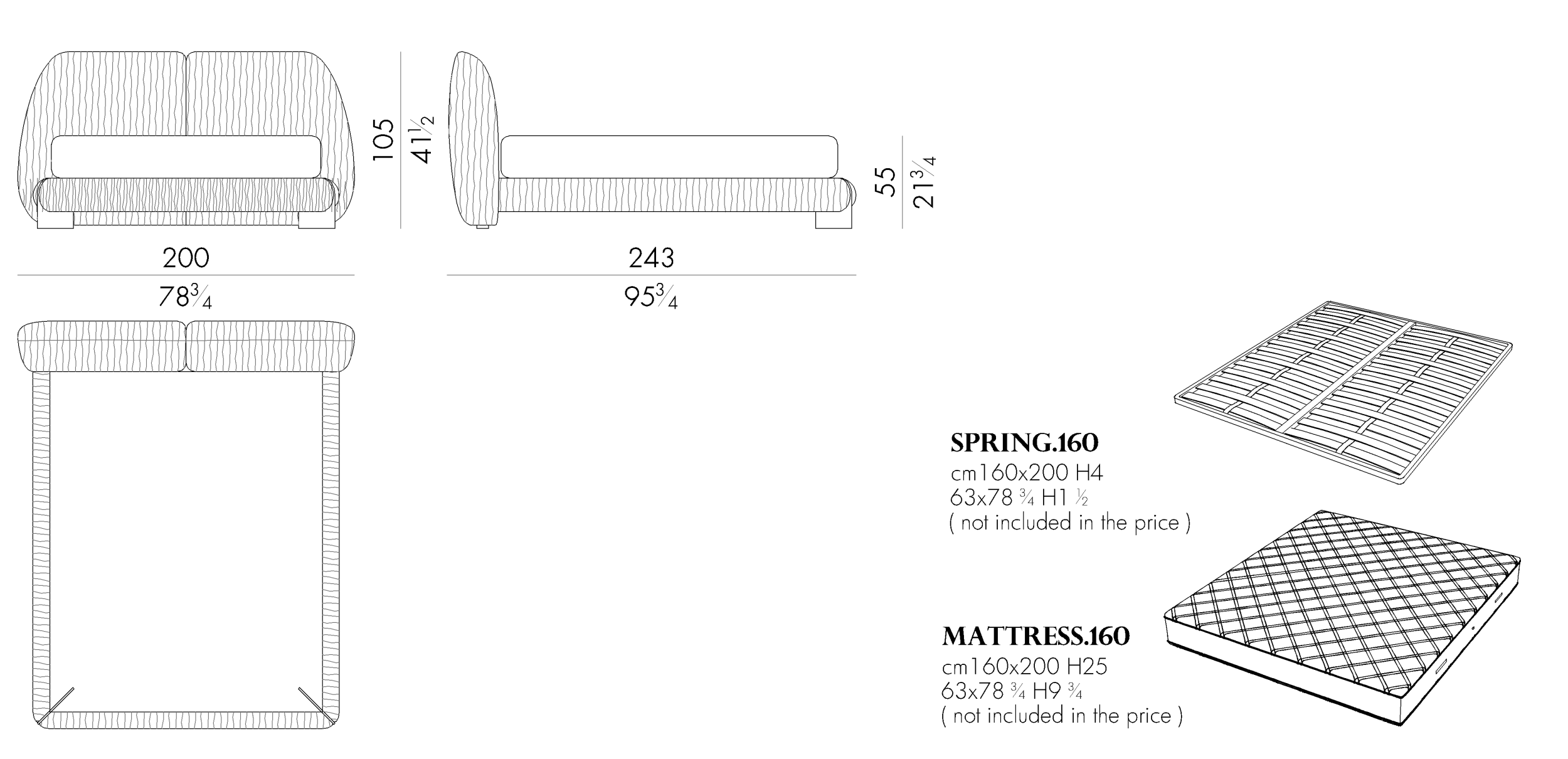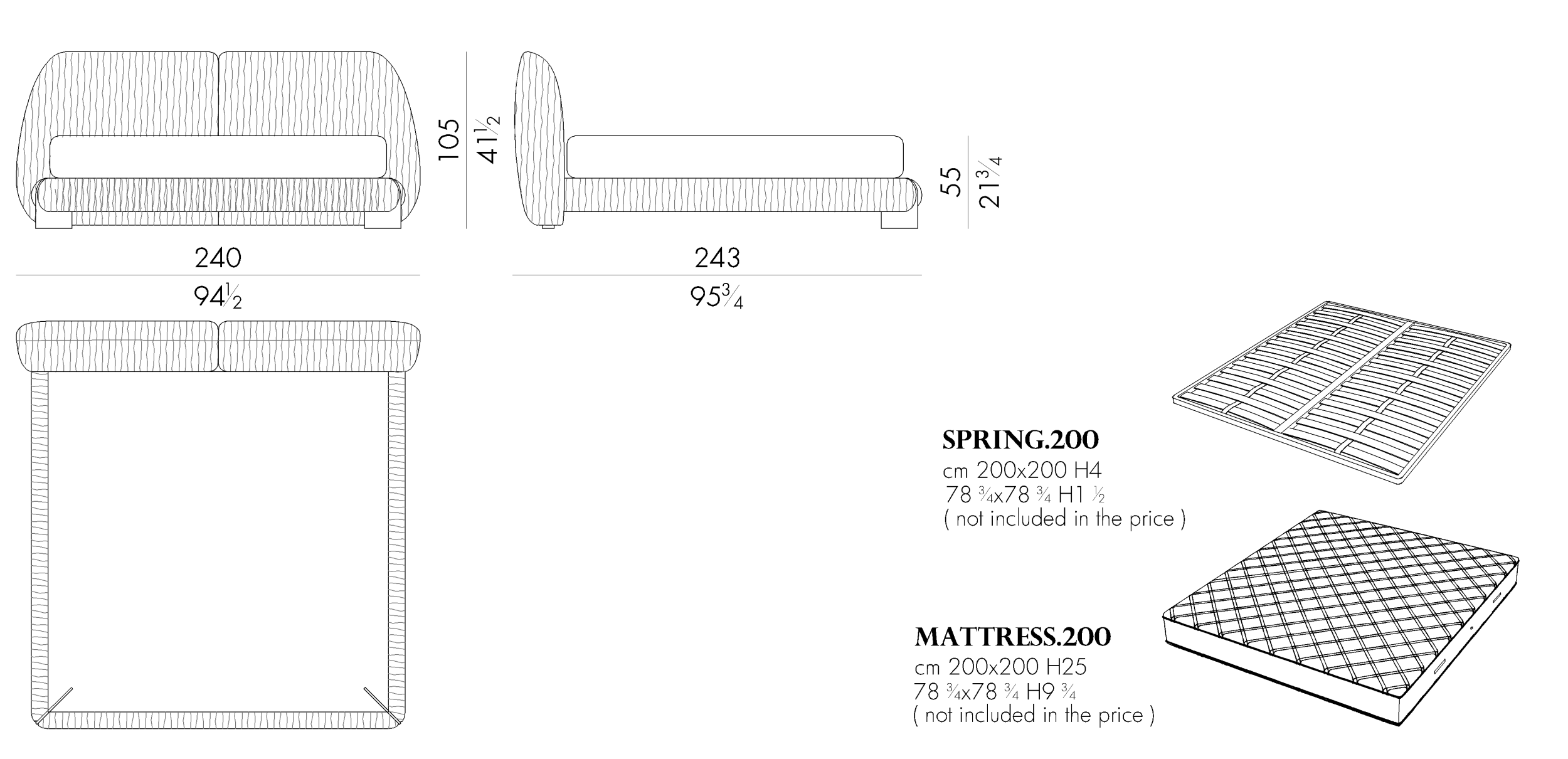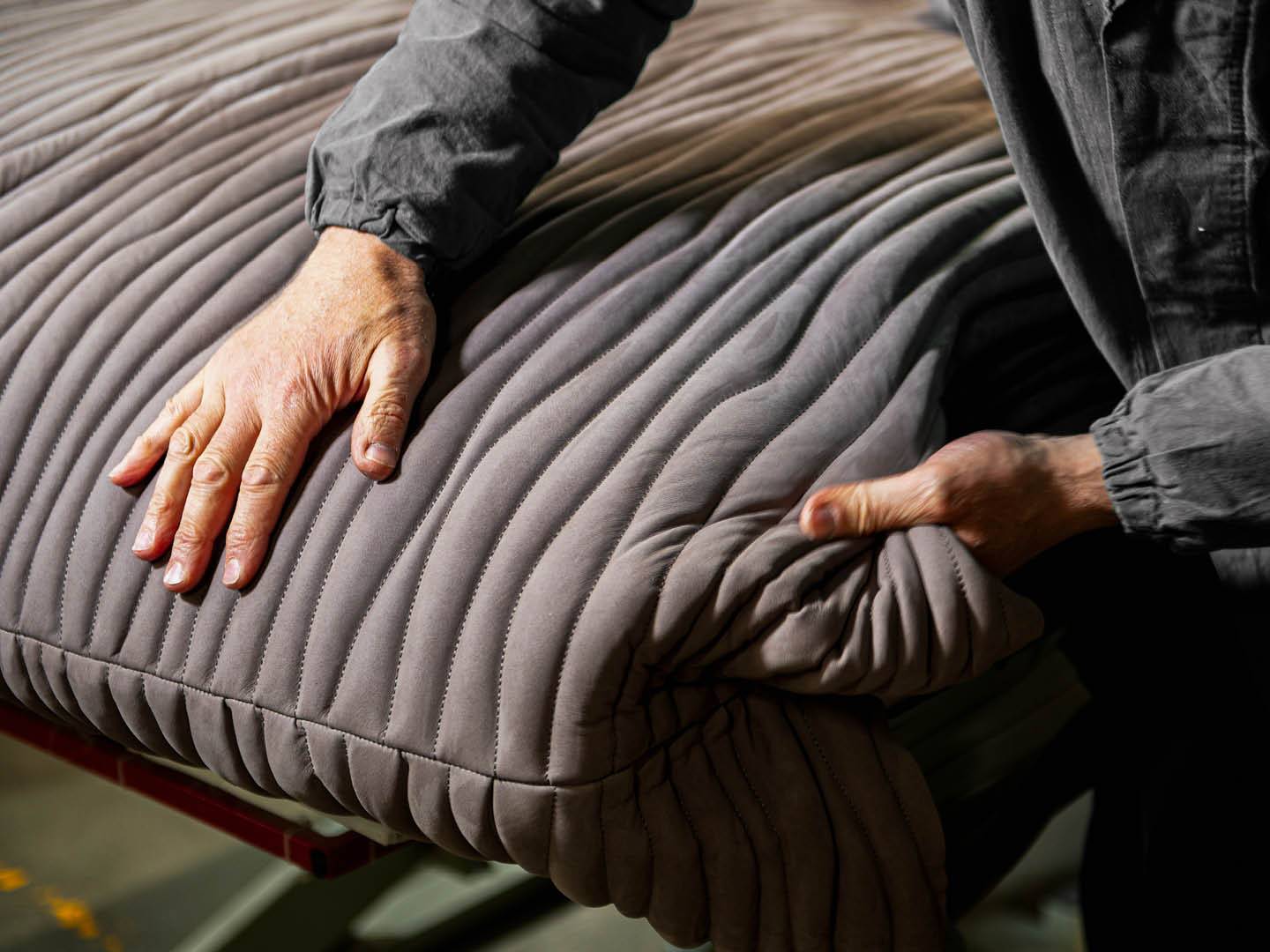 Leaf bed is characterized by a wavy pattern embroidery that covers the entire surface, enhancing the sinuosity of its shape. The metal details that support the bed frame give a touch of uniqueness. This bed is available completely upholstered in leather or quilted fabric.