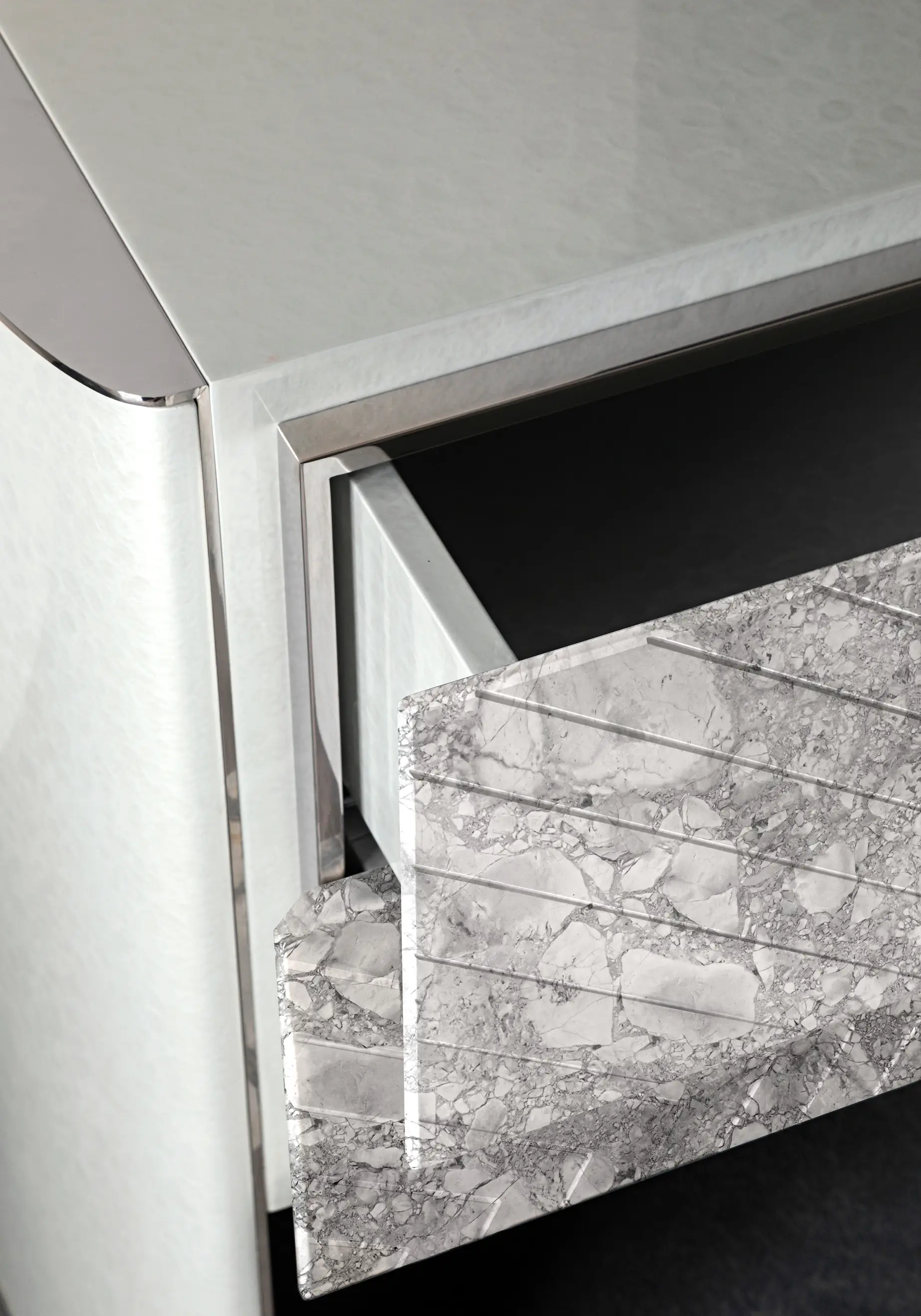 Drawer unit Linfa is an example of combination of different raw materials able to enhance preciousness to this piece of furniture:marble inserts become drawer frontals that match with the rounded lacquered structure while metal parts become decorative details that separate the marble from the structure itself. It is highly recommended for bedrooms but it’s also suitable for villas or flats where design and refinement of materials merge to highlight a modern and elegant look.