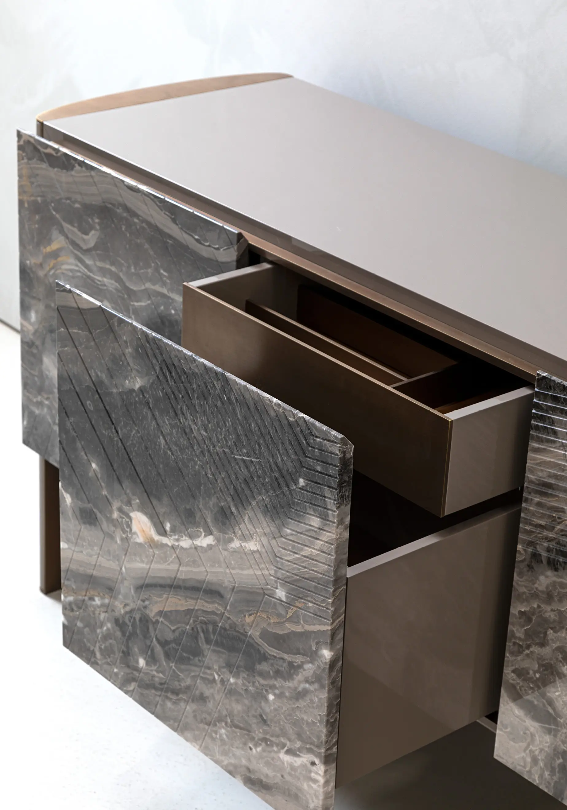 The storage unit Linfa is an example of combination of different raw materials able to enhance preciousness to this piece of furniture. Marble inserts become drawer frontals that match with the rounded lacquered structure while metal parts become decorative details that separate the marble from the structure itself. Metal and leather are also characterizing elements in the two smaller drawers that can contain precious assortments of cutlery.