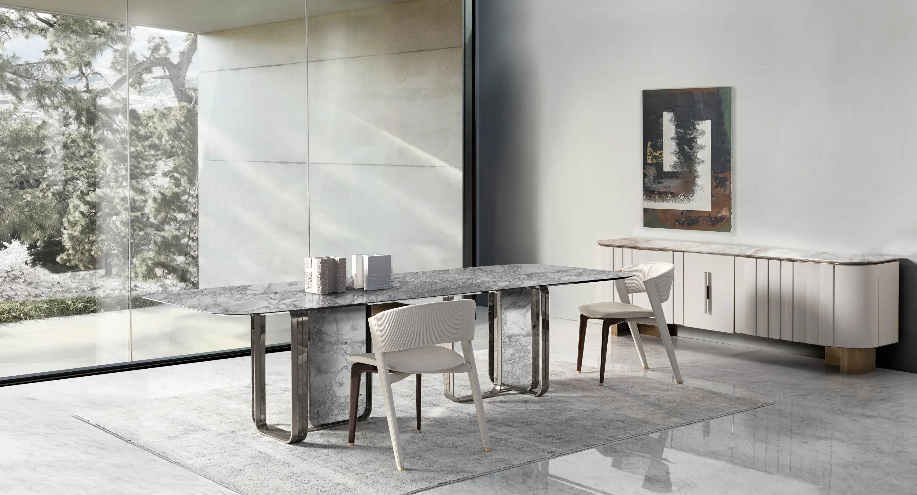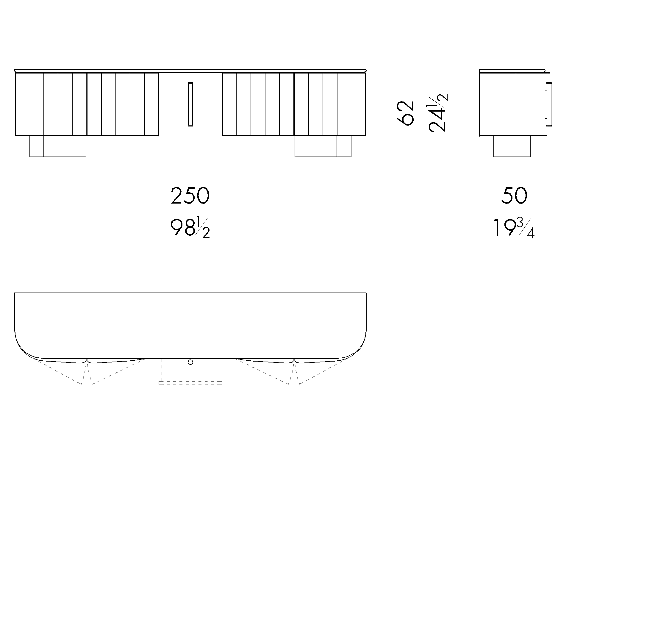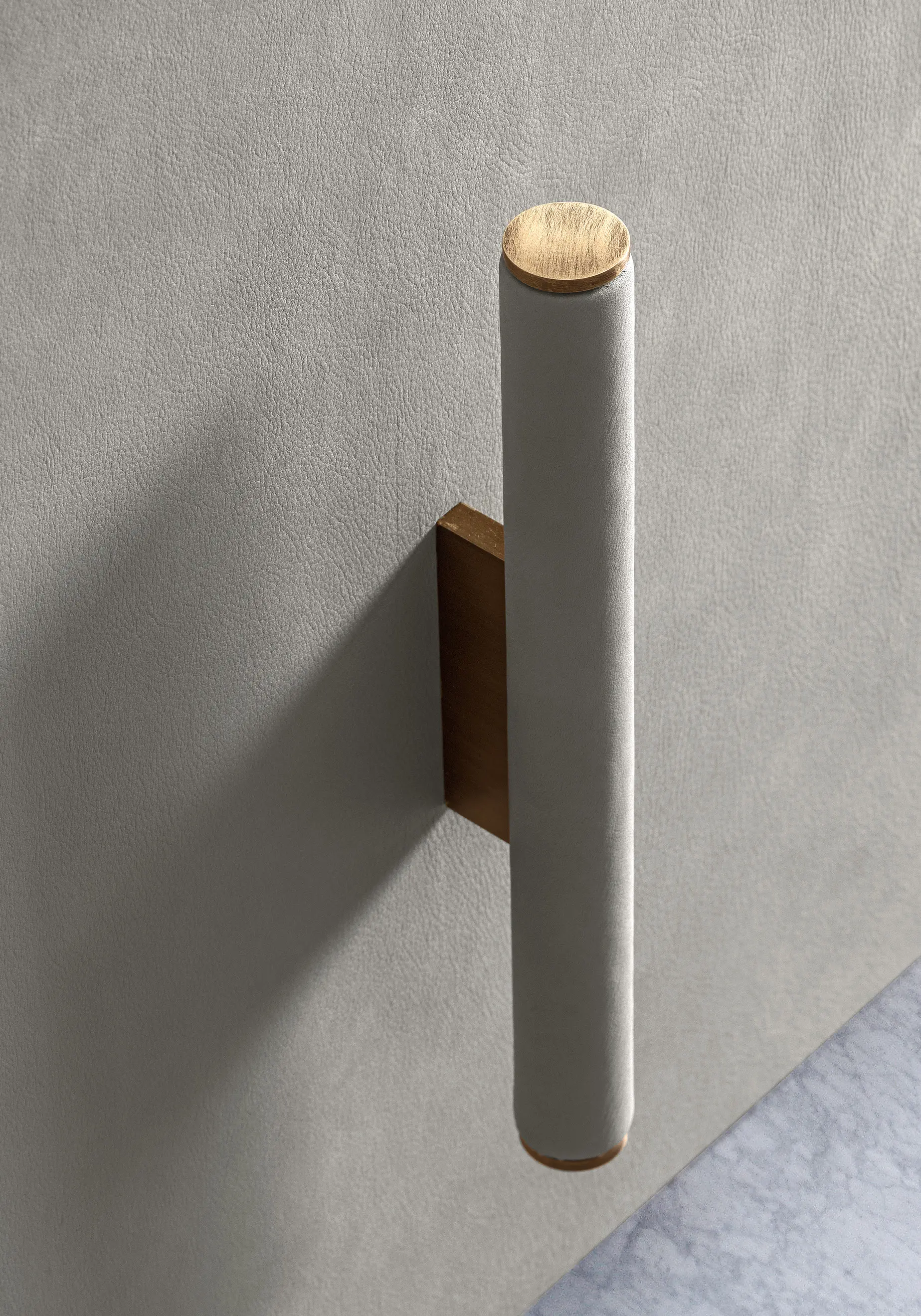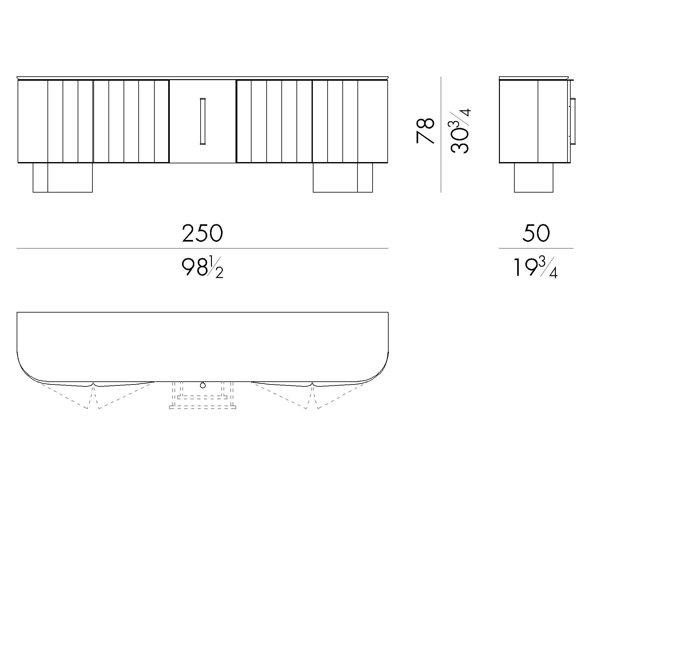 The doors of Morgan storage unit are shaped three-dimensionally with vertical decorative motif and upholstered in leather with “plissè” effect. The handle of the central door consists of a single cylindrical element placed in the center of the storage unit, while the side doors can be opened by pulling a metal plate that protrudes elegantly from the upper profile. Metal plays not only an aesthetic and functional role of door finishing, but is also present in the two elements that support the structure. Finally, the marble top has lowered edge to ensure an almost suspended effect compared to the underlying metal. The four-doors version of Morgan storage unit represents an interesting proposal for the living area.