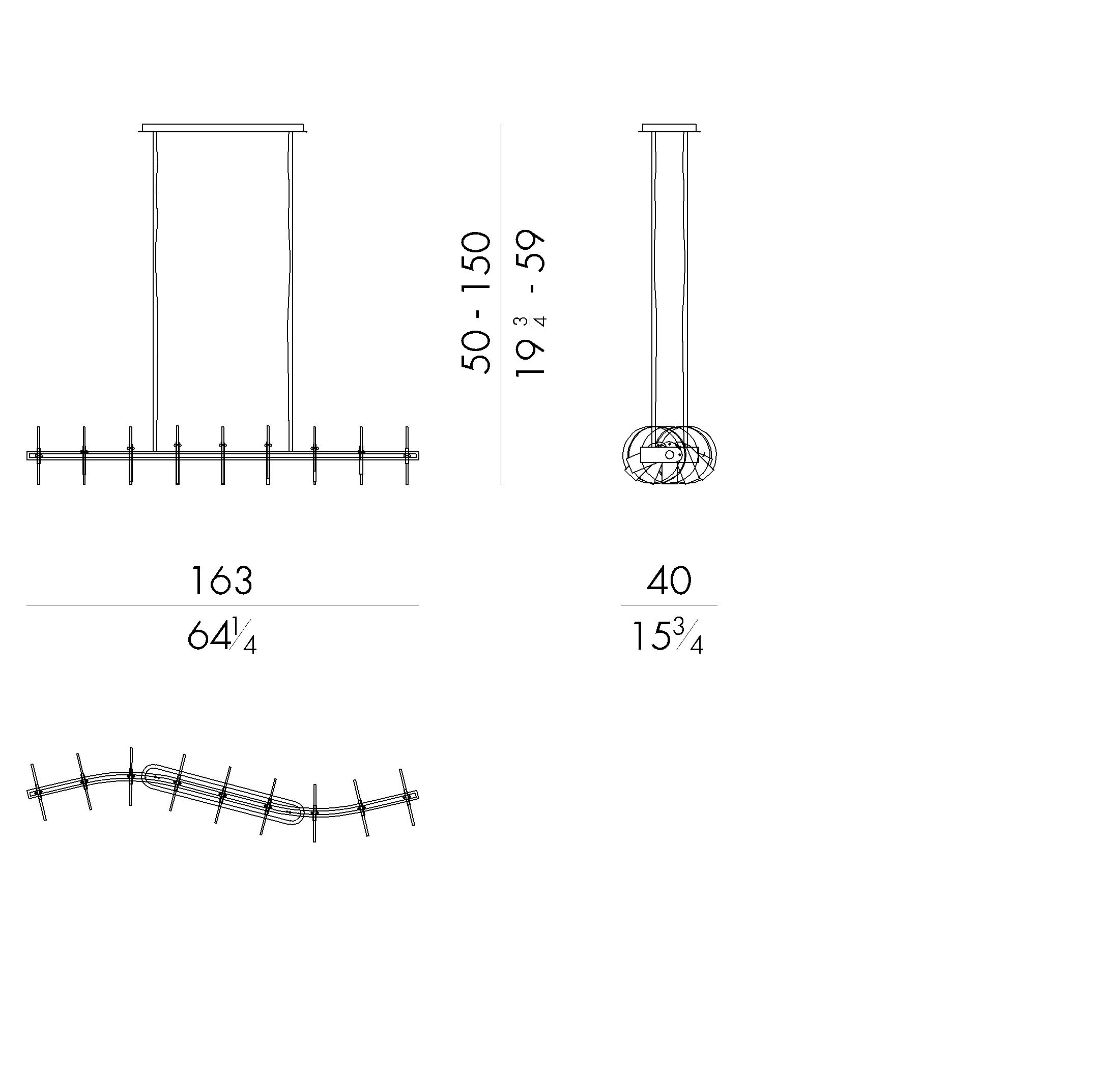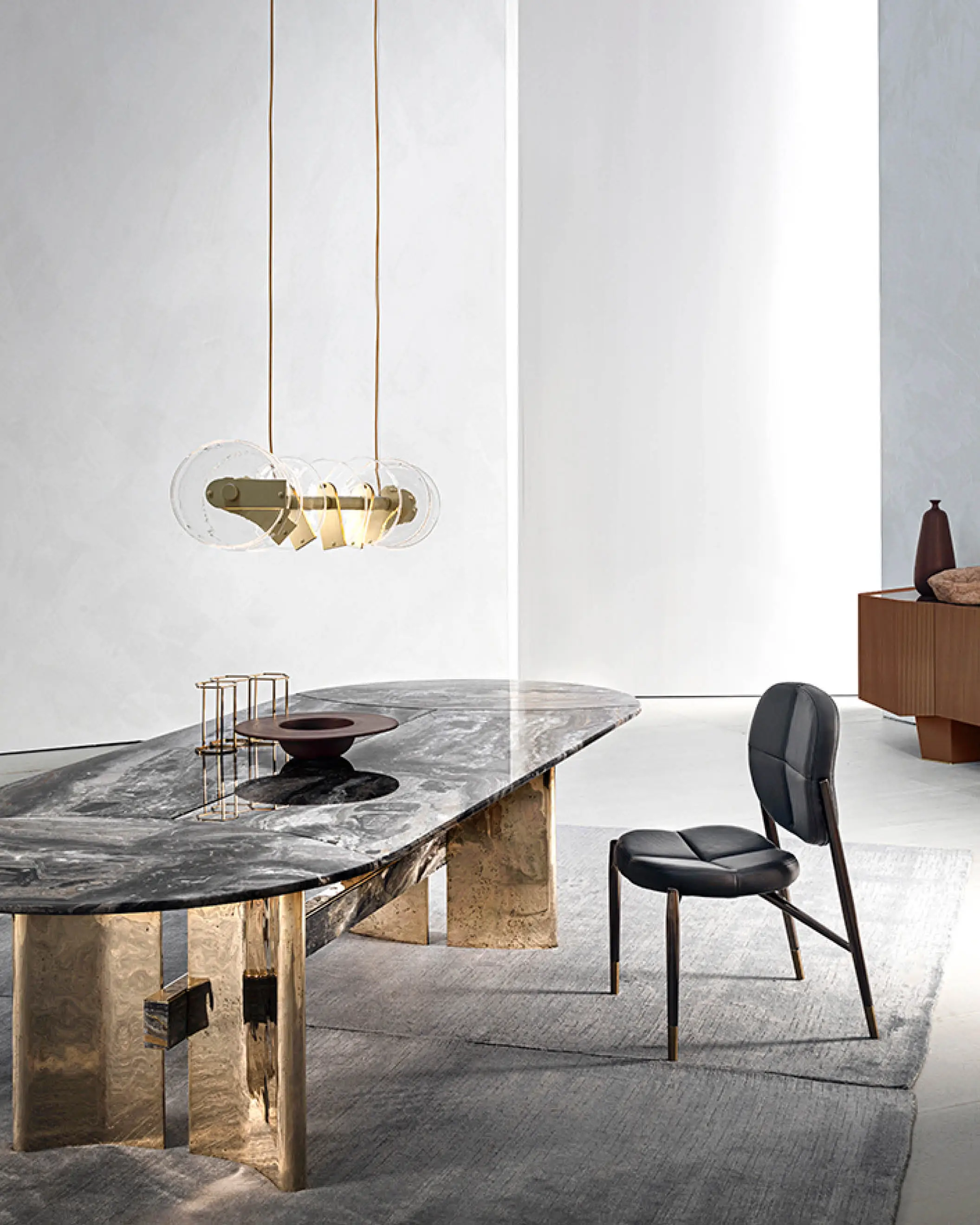 In the chandelier Nebula an “S” shaped metal bar is embellished with artistic glass discs. The metal bar finish is matt gold while the artistic glass elements are realized by master glassmakers of Venice area. The irregular glass surfaces, always different from each other, are enlightened by led stripes that are placed into the metal structure. Thanks to its sinuous and long shape, this chandelier suits to a refined and contemporary dining area.