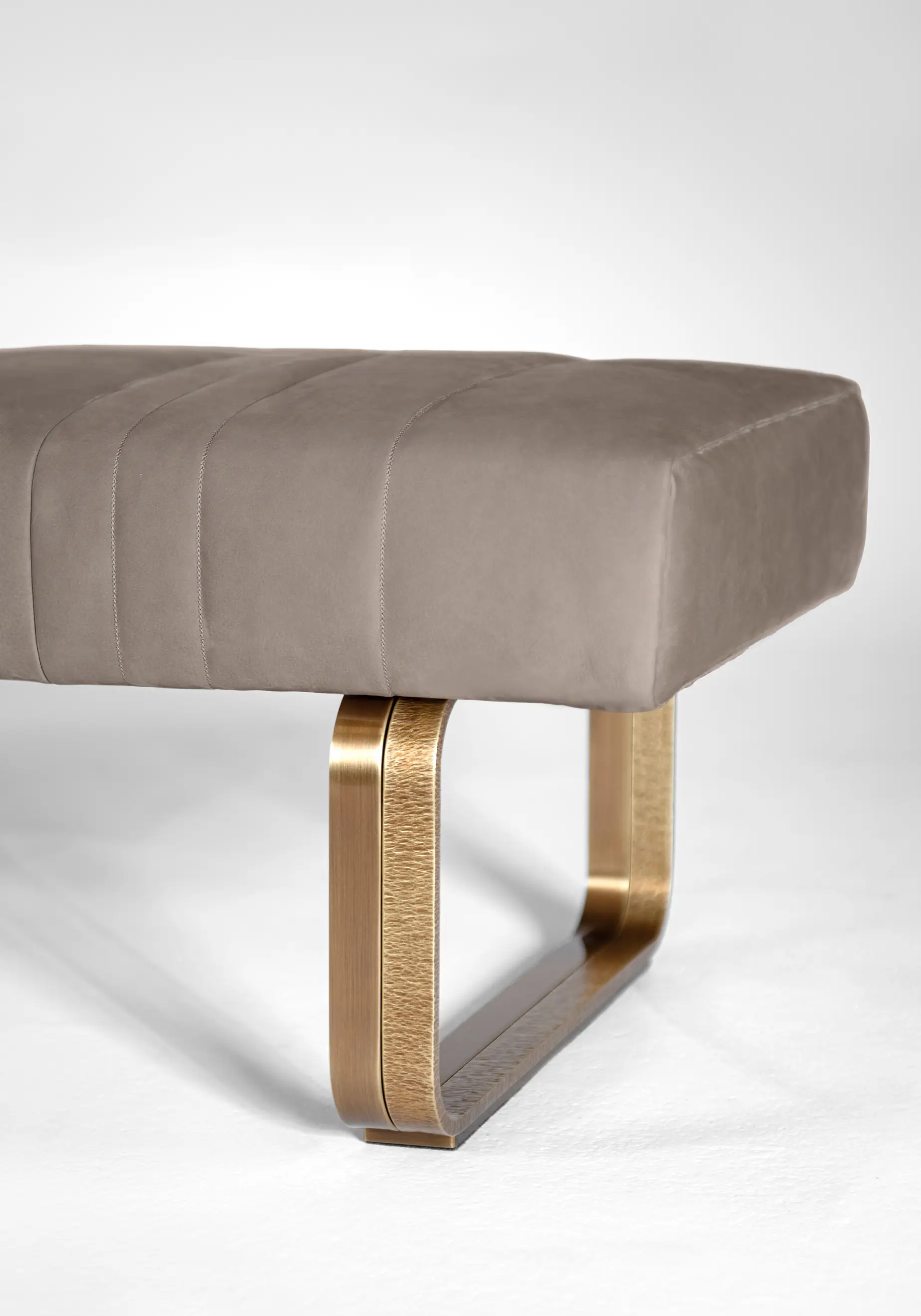 With a rounded design, Nova bench is designed to be matched with Novabed. The seat, available both in leather and fabric upholstery, is enriched by vertical stitchings. The strong point of Nova bench is represented by the metal frame that supports the seat, the "leitmotif" of Nova collection.