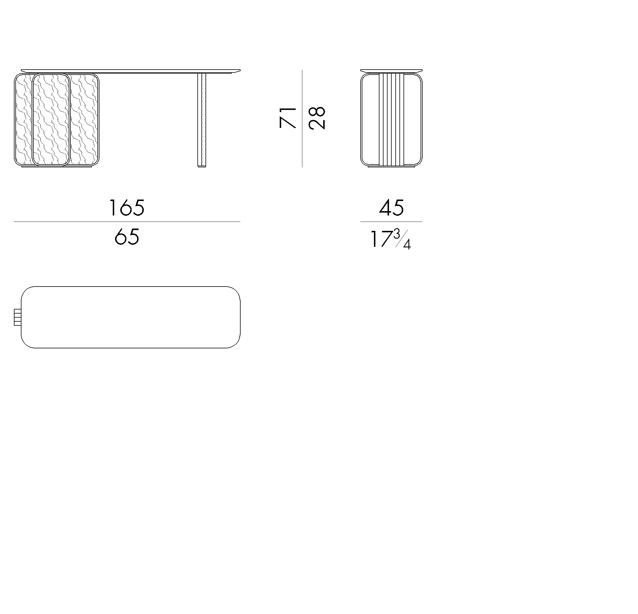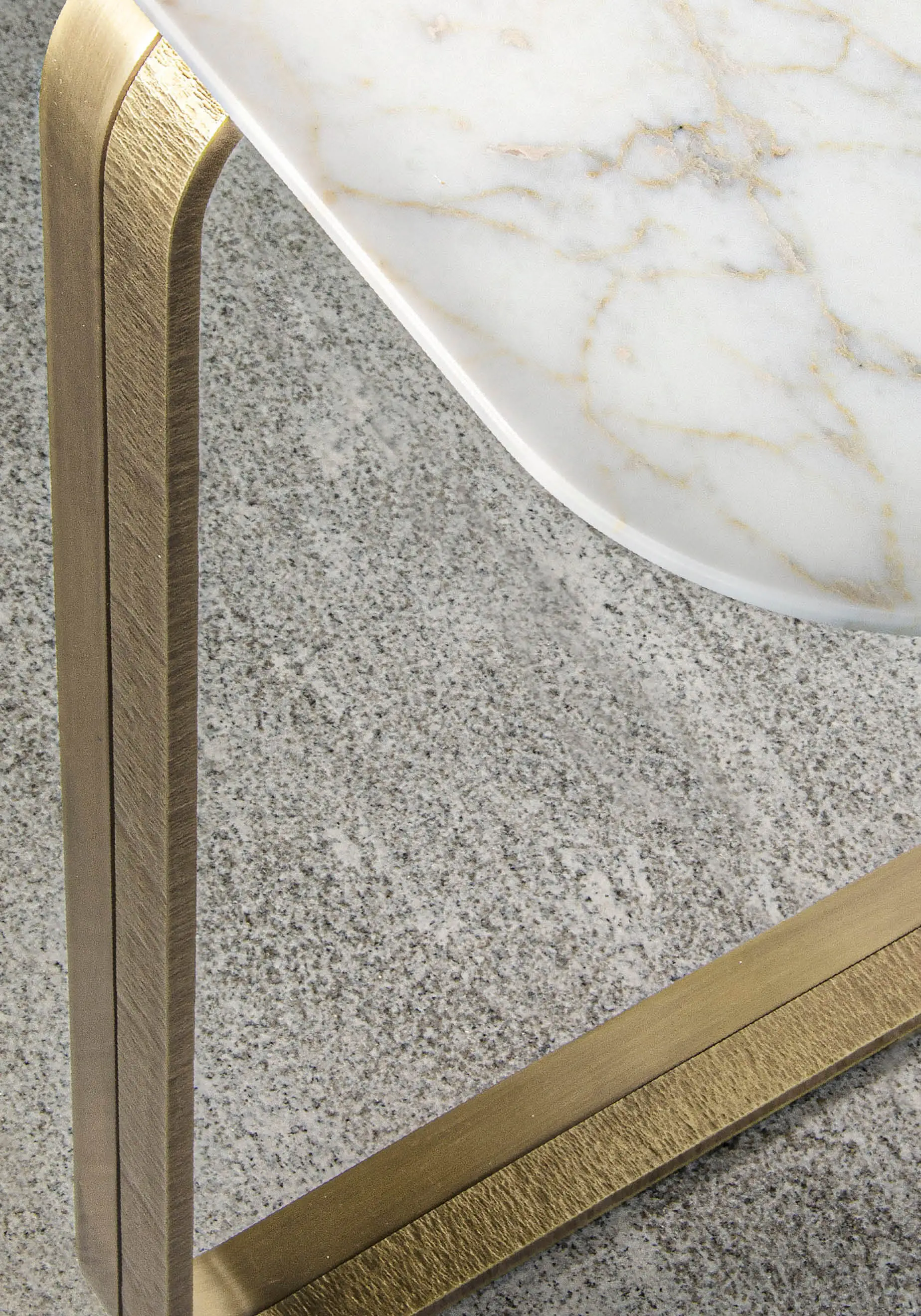 Nova console, as well as other coffee tables of this collection, is characterized by a marble top that becomes thinner along the border with rounded corners. The strong point of this piece is represented by precious metal base that envelopes a vertical marble slab.