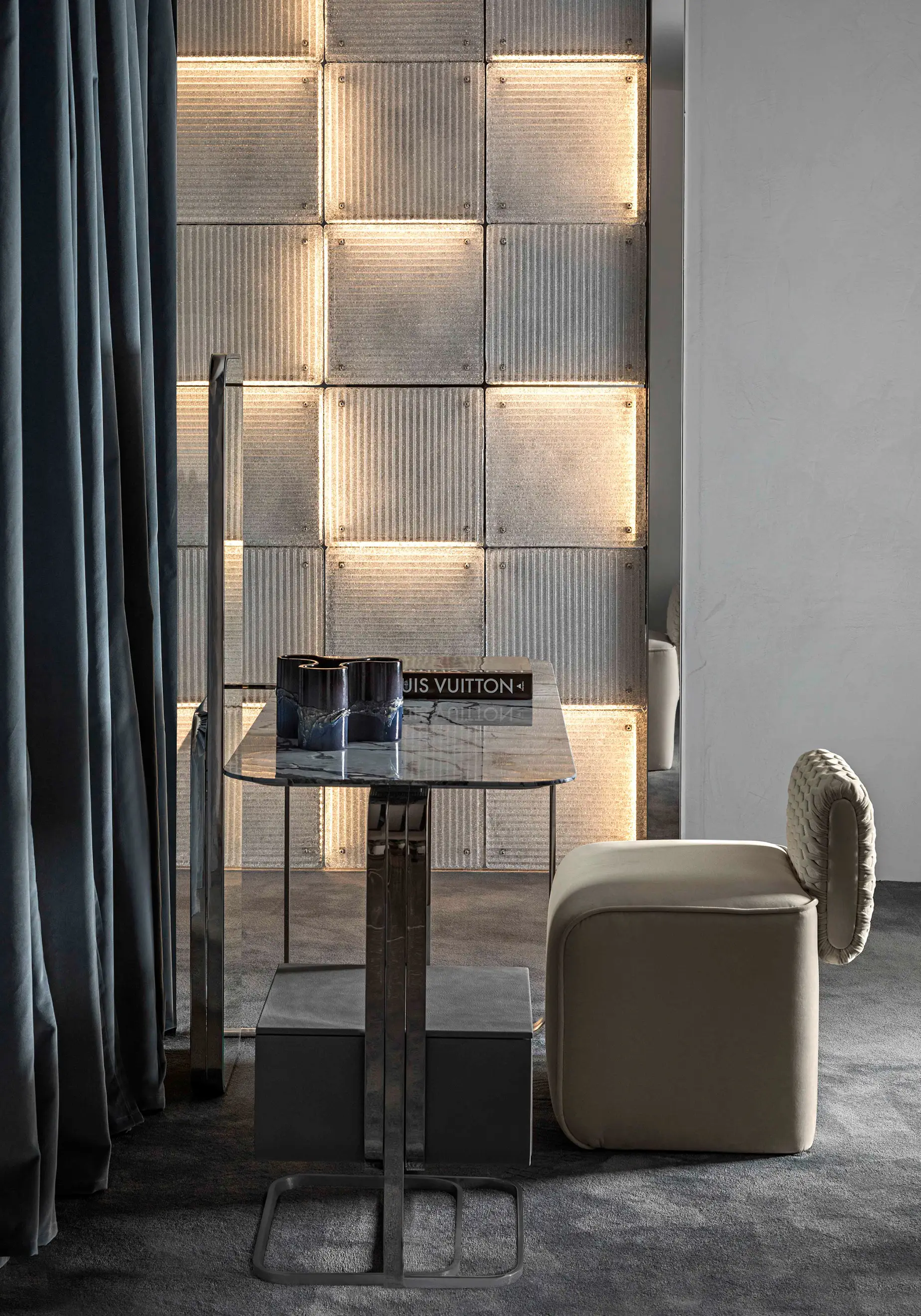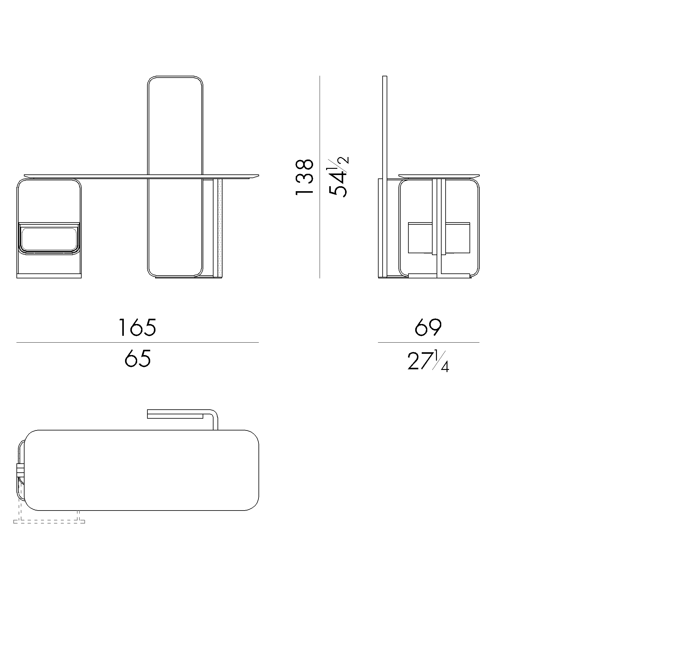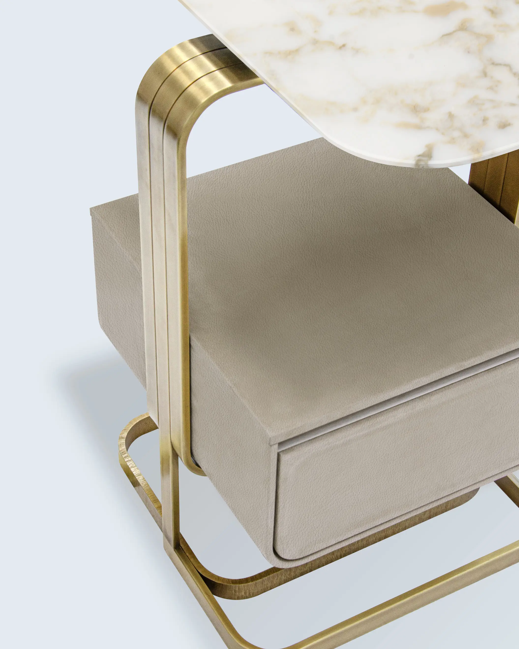 Nova vanity has been designed for female customers looking for a corner dedicated to their “make up”. Like other pieces from the same collection, it is characterized by a double-ring metal base. The metal, moulded in the shape of a flattened ring, is realized in shiny or matt finish, with hand-worked parts with a unique sculptural effect. The accuracy of each detail is clearly visible even in the drawer, upholstered with soft leather.
