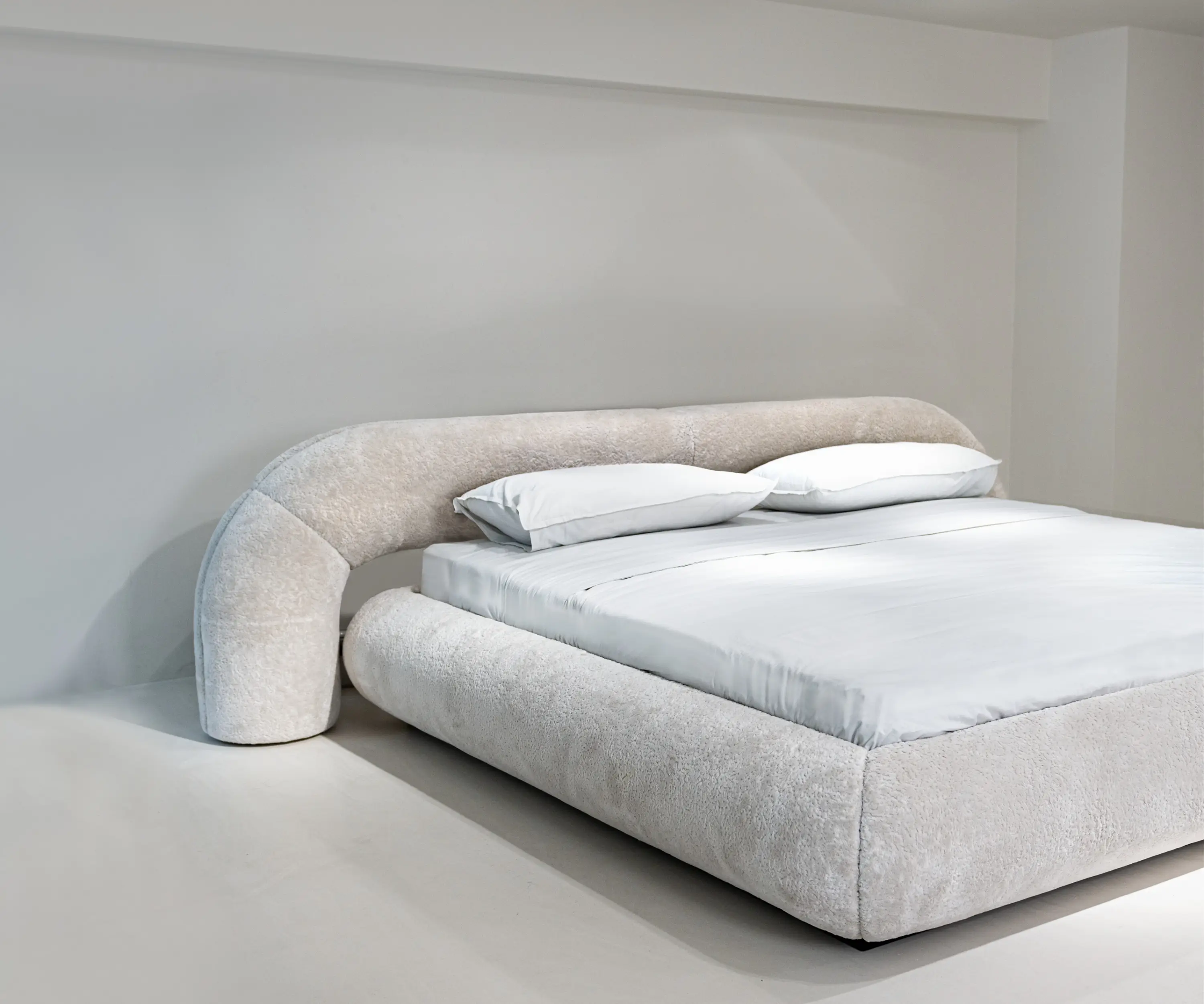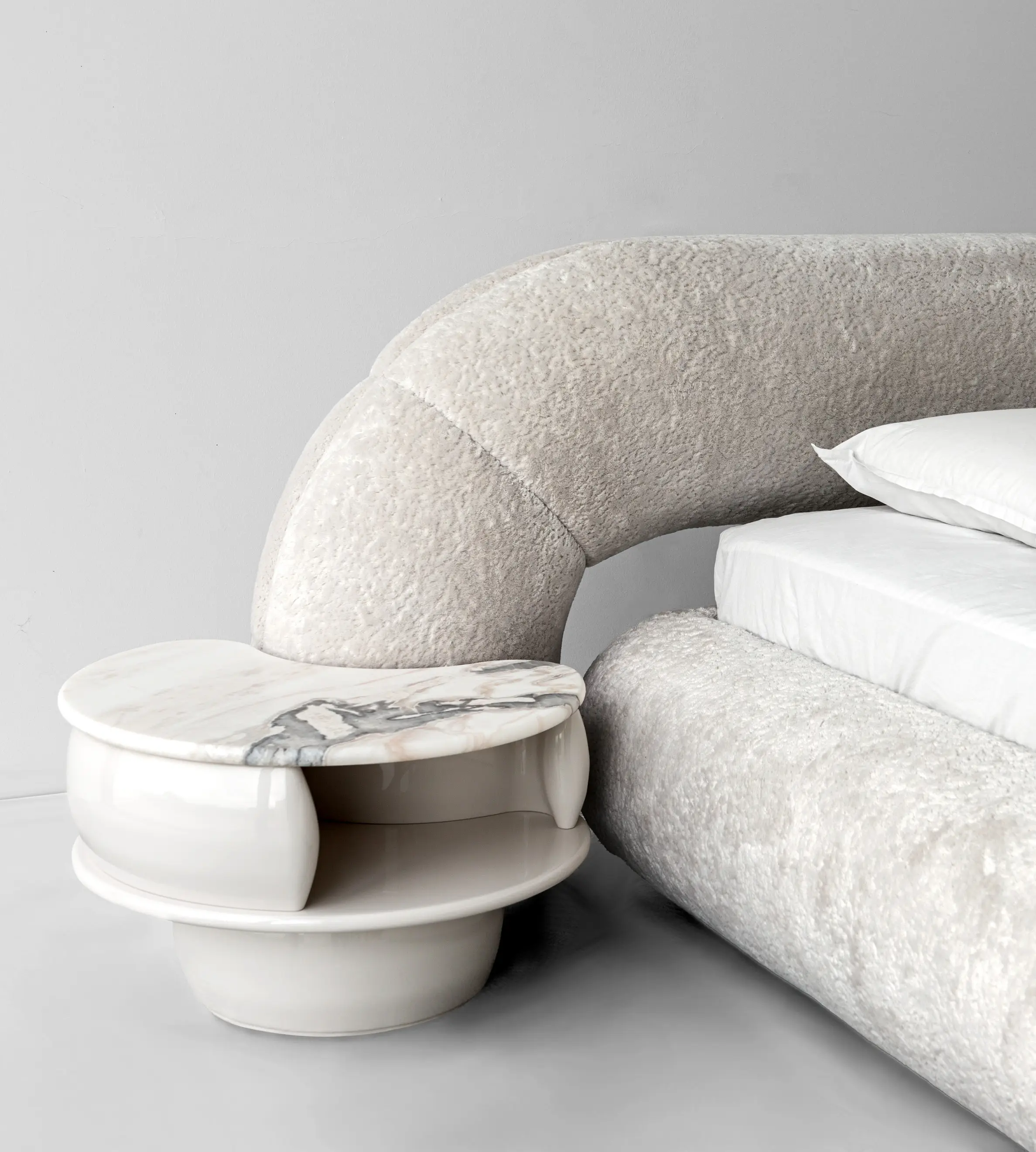 In the heart of every room, the Snap bed emerges as a bold creation that challenges the conventional canons of design. It finds its maximum expression when positioned at the center of the ambiance, where its distinctive shape becomes the undisputed protagonist. The round structure stretches around the mattress ending in a sinuous arch in the headboard. It can be upholstered entirely in high quality fabric or leather. The upholstery without visible stitching adds a touch of elegance and refinement. It is possible to complete the bed with Snap night tables, whose shape fits perfectly with the curve of the headboard, blending harmoniously together.