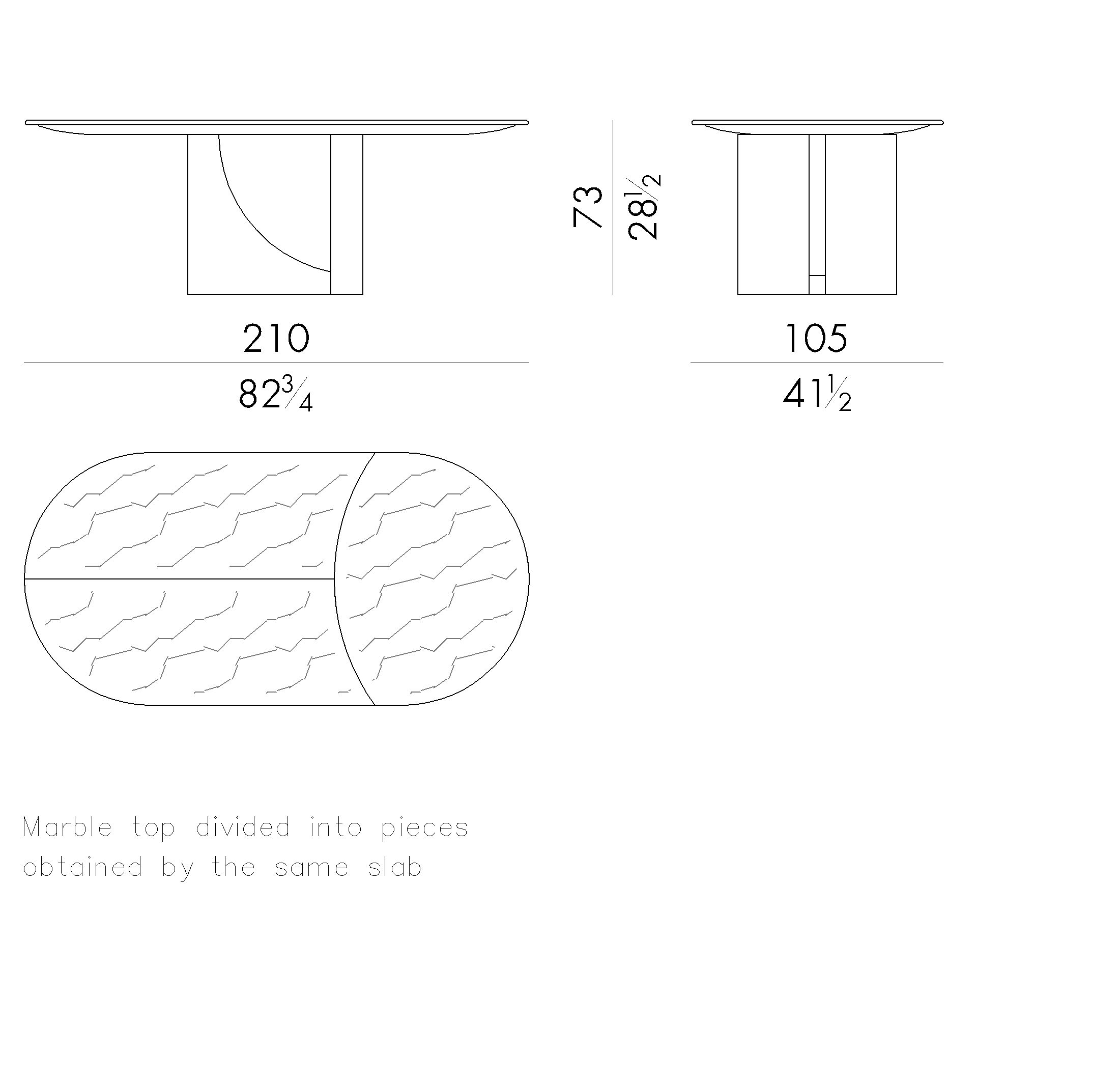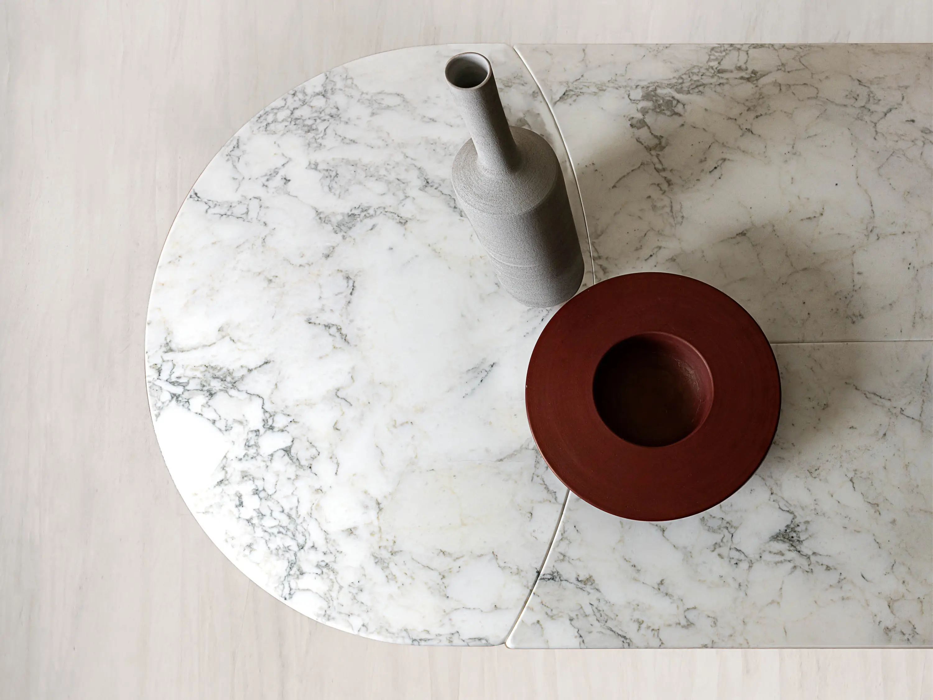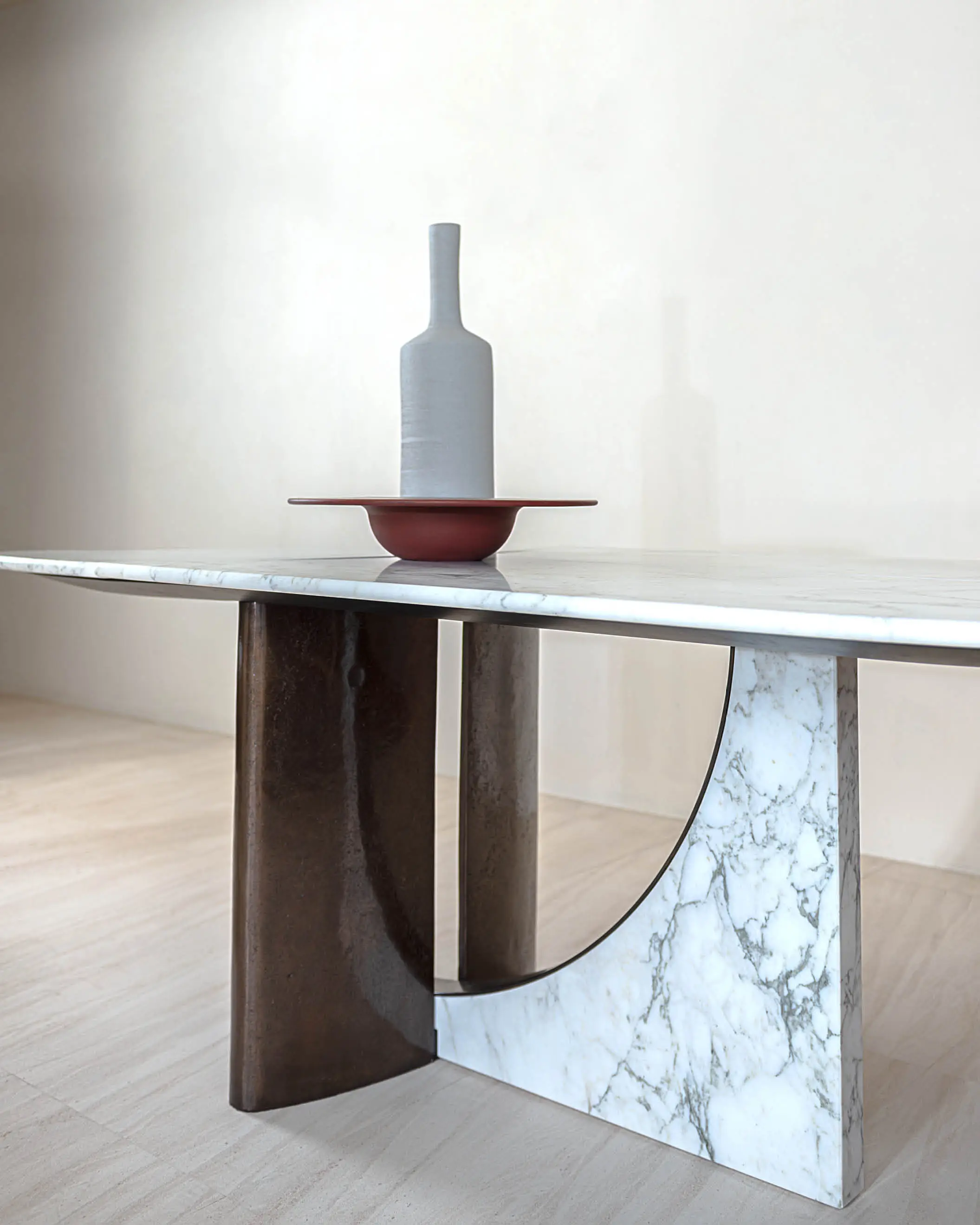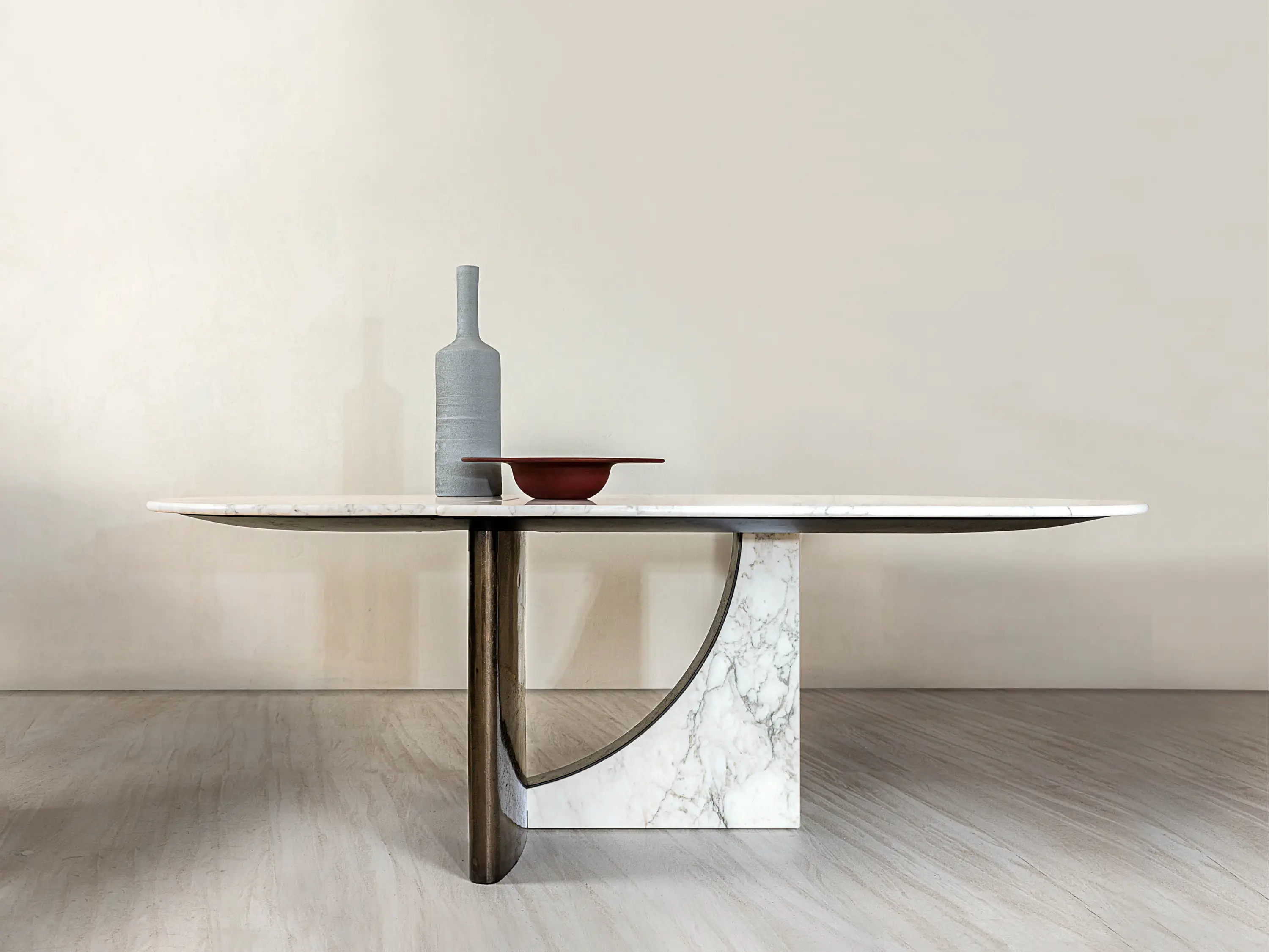 The shapes of dining table Spinnaker take inspiration from elegance and lightness of the sails of the boats that are unfurled to the wind during the sailing. The marble top is available in one unique piece or it can be cut into three curved parts following the structural base with two arches that recall the typical geometry of architecture of the Thirties. The melted brass parts of the base are realized by casting liquid metal into a mold made of special sand.