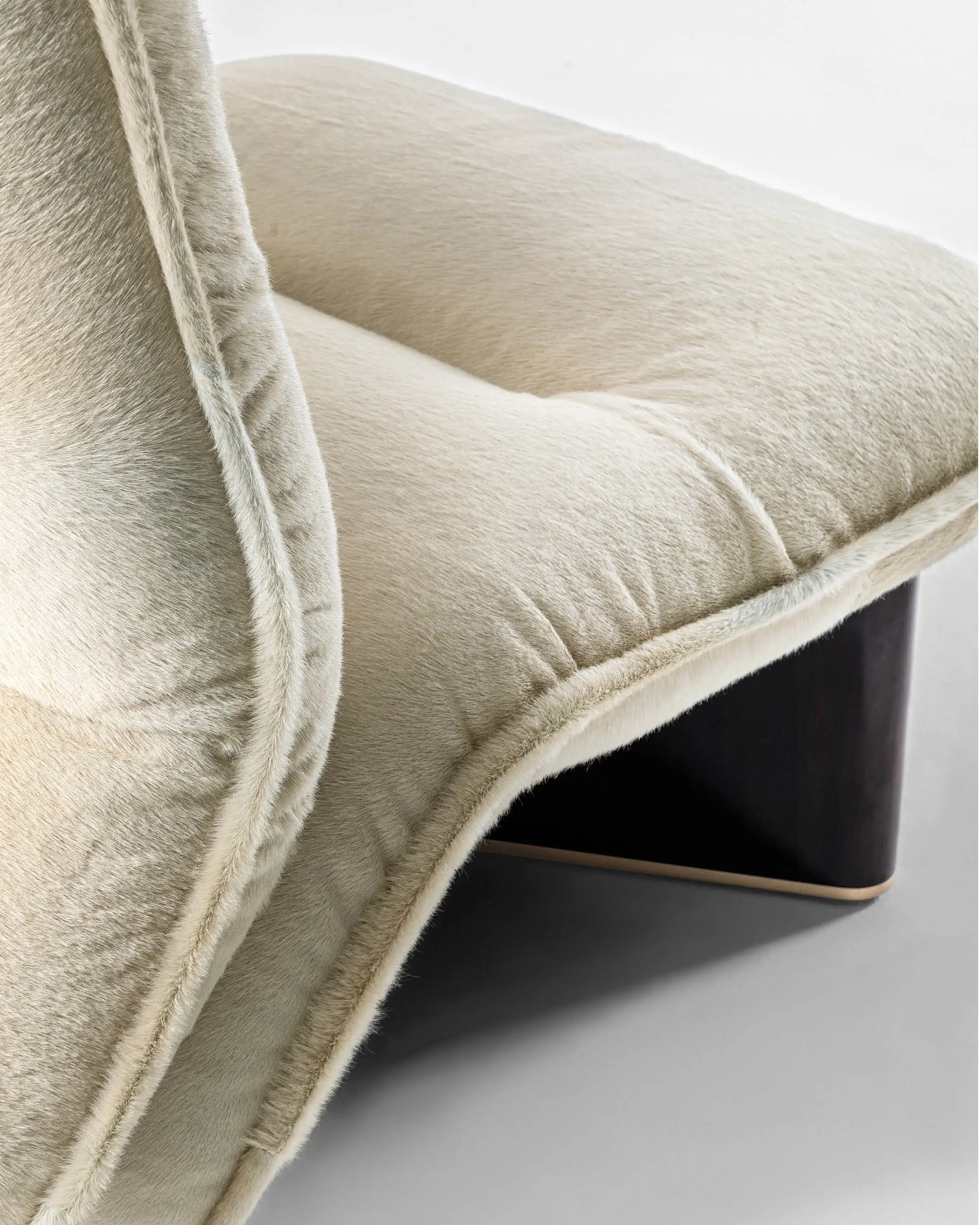 The armchair Ypsilon is the result of the union of two upholstered elements, seat and backside that are perfectly symmetrical. The same ypsilon shape is also recognizable in the base covered with precious ziricote wood and metal details.