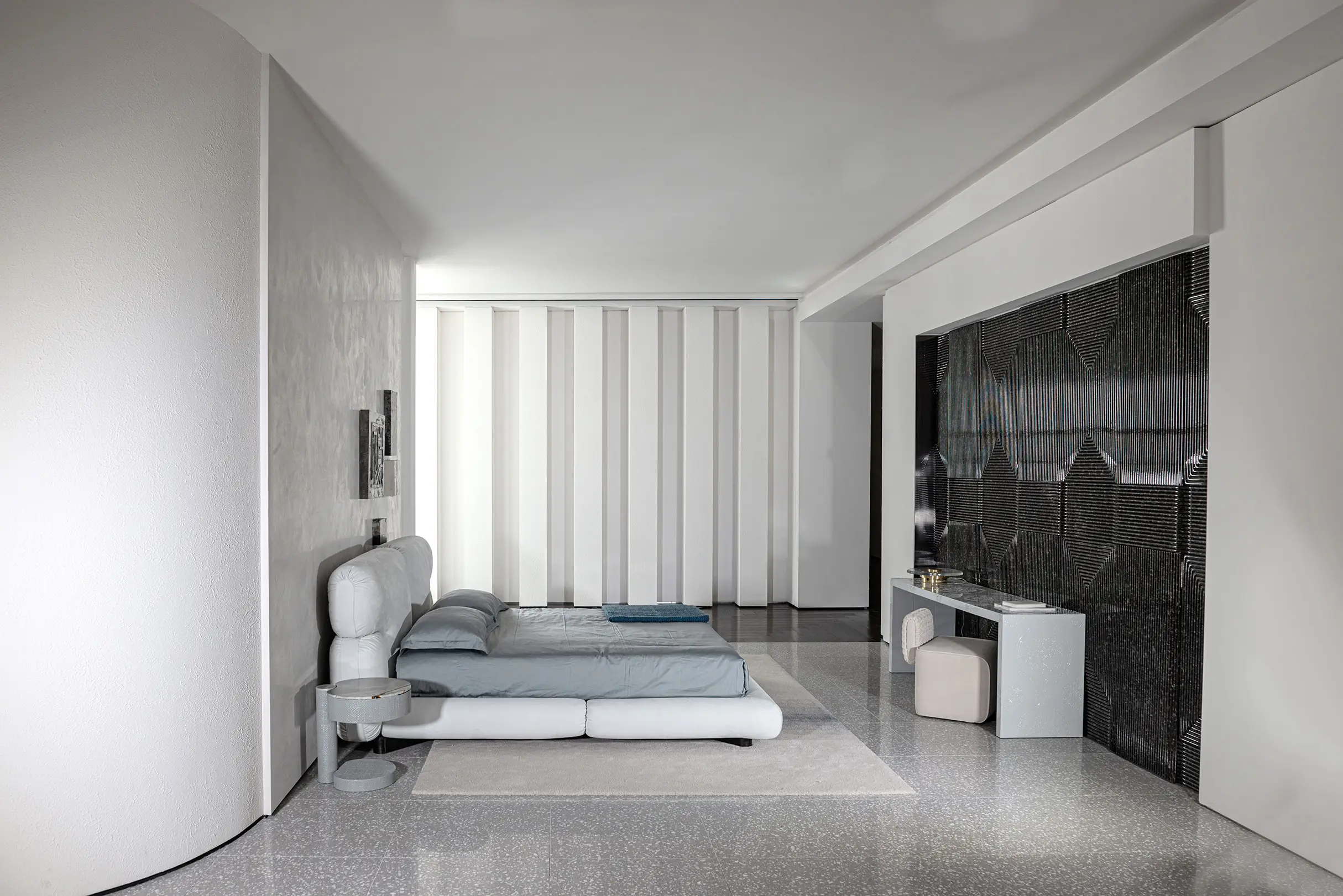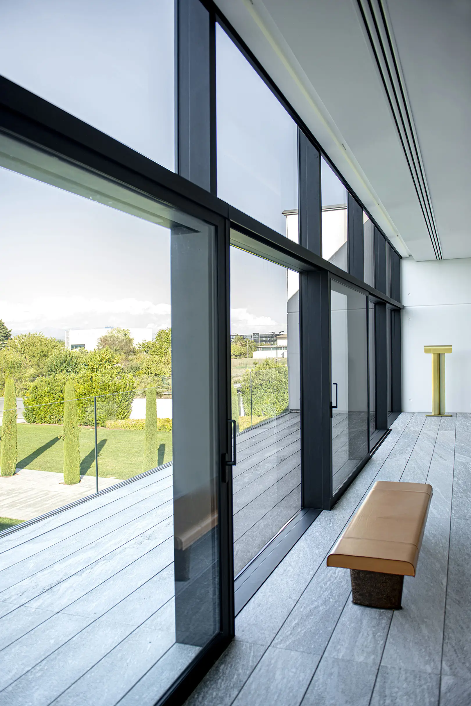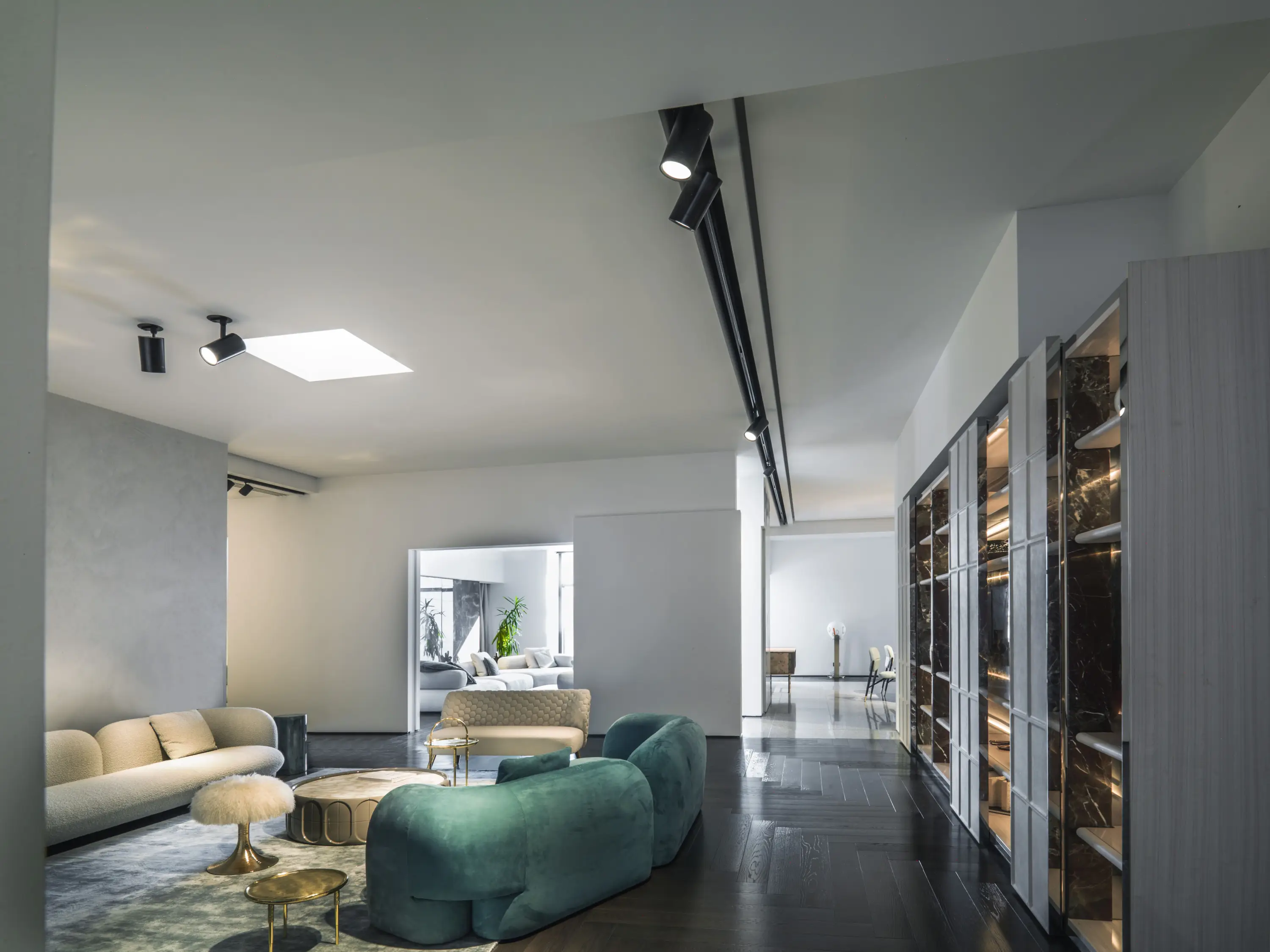 The showroom has been designed with the aim of creating a contemporary villa harmoniously integrated with the outdoor terraces and the large gardens that surround it.