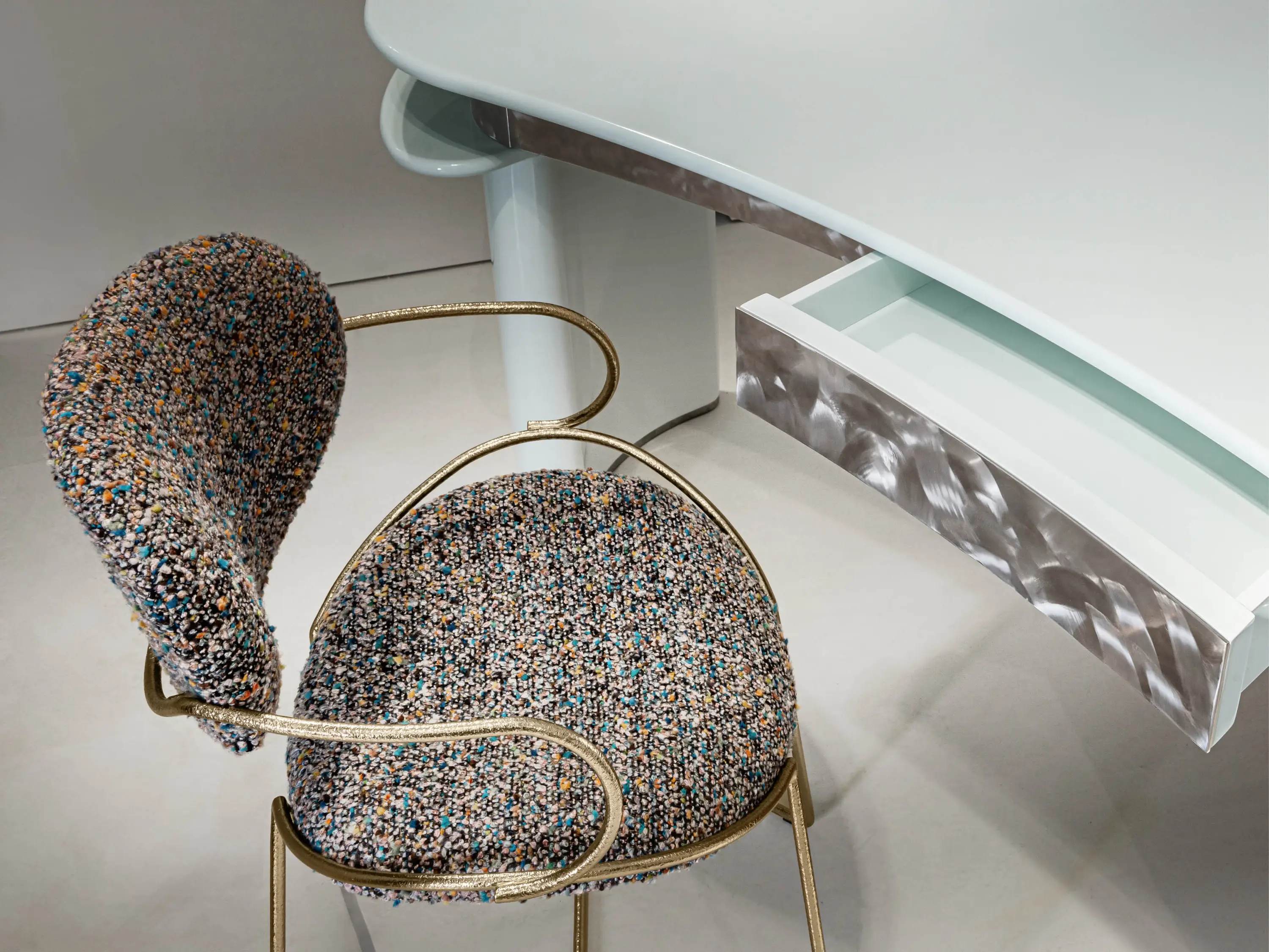 La poltroncina Twig incarna l'essenza della raffinatezza con una struttura in tondino di metallo sottile modanato che avvolge la seduta e sostiene elegantemente lo schienale. Il metallo, sottoposto a una raffinata lavorazione di smerigliatura realizzata da maestri artigiani, conferisce alla poltroncina un'aura di modernità e originalità. L'imbottitura della seduta e dello schienale, disponibili anche con rivestimento in pelliccia di Mongolia, offrono un comfort avvolgente, creando un gioco di contrasti con le parti in metallo.